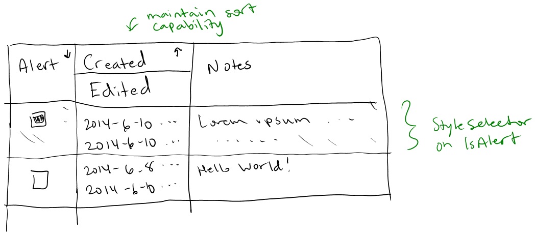 As to the row style triggered by the Alert property, you can use a ConditionalRowStyleSelector to achieve that.