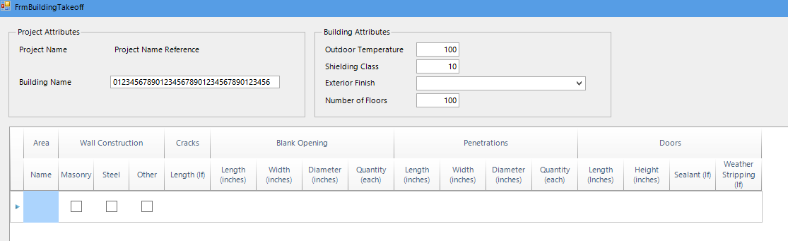 With Me.dvAreas .AllowColumnReorder = False .AllowColumnResize = False .AllowRowReorder = False .AllowRowResize = False .EnableAlternatingRowColor = True .AutoSizeRows = False .TableElement.GroupHeaderHeight = 50 .TableElement.RowHeight = 50 .TableElement.TableHeaderHeight = 50 Dim colID As New GridViewTextBoxColumn() colID.Name = "colID" colID.HeaderText = "Work Area ID" colID.FieldName = "WorkAreaID" colID.MaxLength = 0 colID.TextAlignment = ContentAlignment.MiddleRight colID.IsVisible = False colID.Width = 0 Dim colWorkAreaName As New GridViewTextBoxColumn() colWorkAreaName.Name = "WorkAreaName" colWorkAreaName.HeaderText = "Name" colWorkAreaName.FieldName = "WorkAreaName" colWorkAreaName.MaxLength = 15 colWorkAreaName.TextAlignment = ContentAlignment.MiddleLeft colWorkAreaName.IsVisible = True colWorkAreaName.Width = 100 Dim colWallConstructionMasonry As New GridViewCheckBoxColumn() colWallConstructionMasonry.Name = "WCMasonry" colWallConstructionMasonry.HeaderText = "Masonry" colWallConstructionMasonry.FieldName = "WCMasonry" colWallConstructionMasonry.TextAlignment = ContentAlignment.MiddleLeft colWallConstructionMasonry.IsVisible = True colWallConstructionMasonry.Width = 100 Dim colWallConstructionSteel As New GridViewCheckBoxColumn() colWallConstructionSteel.Name = "WCSteel" colWallConstructionSteel.HeaderText = "Steel" colWallConstructionSteel.FieldName = "WCSteel" colWallConstructionSteel.TextAlignment = ContentAlignment.MiddleLeft colWallConstructionSteel.IsVisible = True colWallConstructionSteel.Width = 100 Dim colWallConstructionOther As New GridViewCheckBoxColumn() colWallConstructionOther.Name = "WCOther" colWallConstructionOther.HeaderText = "Other" colWallConstructionOther.FieldName = "WCOther" colWallConstructionOther.TextAlignment = ContentAlignment.MiddleLeft colWallConstructionOther.IsVisible = True colWallConstructionOther.Width = 100 .MasterTemplate.Columns.Add(colID) .MasterTemplate.Columns.Add(colWorkAreaName) .MasterTemplate.Columns.Add(colWallConstructionMasonry) .MasterTemplate.Columns.Add(colWallConstructionSteel) .MasterTemplate.Columns.Add(colWallConstructionOther) Dim view As New ColumnGroupsViewDefinition() view.ColumnGroups.Add(New GridViewColumnGroup("Work Area")) view.ColumnGroups.Add(New GridViewColumnGroup("Wall Construction")) view.ColumnGroups(0).Rows.Add(New GridViewColumnGroupRow()) view.ColumnGroups(0).Rows(0).ColumnNames.Add("WorkAreaName") view.ColumnGroups(1).Rows.Add(New GridViewColumnGroupRow()) view.ColumnGroups(1).Rows(0).ColumnNames.Add("WCMasonry") view.ColumnGroups(1).Rows(0).ColumnNames.Add("WCSteel") view.ColumnGroups(1).Rows(0).ColumnNames.Add("WCOther") .ViewDefinition = view