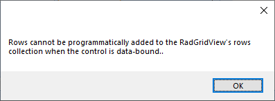 "Rows can not be add programmatically added to the rad radgridview's Rows collection when the control is data-bound"
