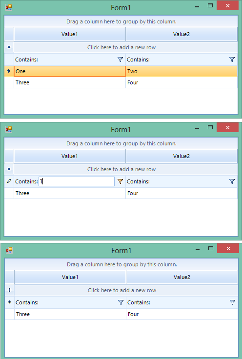 After the filter value Contains "T" is entered the first row is correctly filtered.