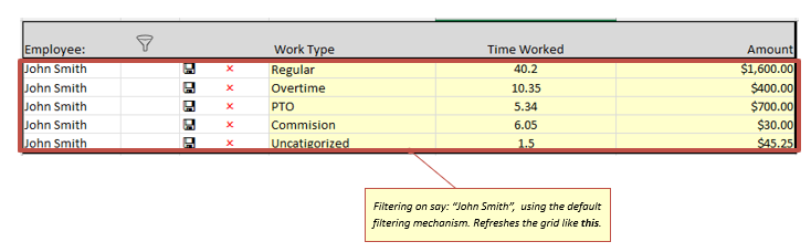 Thank you for your answer to my merged rows question previously. Now I have the problem of getting the grid contents to sustain the format if I use Filter, Clear buttons in the Filter pop up or Sort. Example: