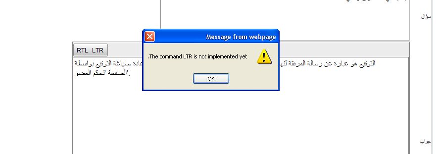 <%@ Control Language="C#" AutoEventWireup="true" CodeFile="FAQsSubUserControl.ascx.cs" Inherits="FAQsSubUserControl" %> <%@ Register TagPrefix="telerik" Namespace="Telerik.Web.UI" Assembly="Telerik.Web.UI" %> <table id="Table2" cellspacing="2" cellpadding="1" width="100%" border="1" rules="none" style="BORDER-COLLAPSE: collapse"> <tr align="right"> <td colspan="2"><b>FAQs Details</b></td> </tr> <tr align="right"> <td> <table id="Table3" cellspacing="1" cellpadding="1" width="100%" border="0"> <tr> <td></td> <td></td> </tr> <tr> <td> </td> </tr> <tr> <td> <asp:Label ID="FAQsGrpLabel" runat="server" Text="<%$ Resources:Resource, SecureSqlServerFAQsRadGridsSubWUCFAQsGrpLabel %>"></asp:Label> </td> <td> <telerik:RadTextBox id="FAQsGrpRadTextBox" runat="server" Text='<%# DataBinder.Eval( Container, "DataItem.FAQsGrp") %>' tabIndex="2" Width="500px"></telerik:RadTextBox> </td> </tr> <tr> <td> <asp:Label ID="QustnLabel" runat="server" Text="<%$ Resources:Resource, SecureSqlServerFAQsRadGridsSubWUCQustnLabel %>"></asp:Label> </td> <td> <telerik:RadTextBox id="QustnRadTextBox" runat="server" Text='<%# DataBinder.Eval( Container, "DataItem.Qustn") %>' TextMode="MultiLine" Rows="6" tabIndex="3" Width="500px"></telerik:RadTextBox> </td> </tr> <tr> <td> <asp:Label ID="AnsrLabel" runat="server" Text="<%$ Resources:Resource, SecureSqlServerFAQsRadGridsSubWUCAnsrLabel %>"></asp:Label> </td> <td> <telerik:RadEditor ID="AnsrRadEditor" Content='<%# DataBinder.Eval( Container, "DataItem.Ansr") %>' runat="server"> <Tools> <telerik:EditorToolGroup> <telerik:EditorTool Name="RTL" ShowText="true" ShowIcon="false" /> <telerik:EditorTool Name="LTR" ShowText="true" ShowIcon="false" /> </telerik:EditorToolGroup> </Tools> </telerik:RadEditor> <script type="text/javascript"> Telerik.Web.UI.Editor.CommandList["RTL"] = function (commandName, editor, args) { var oElem = editor.getSelectedElement(); if (oElem && oElem.tagName == "P") { oElem.setAttribute("dir", "rtl"); oElem.style.textAlign = "right"; } else if (editor.getSelectionHtml())//There is some selection { var toPaste = "<p dir='rtl' style='text-align: right'>" + editor.getSelectionHtml() + "</p>"; editor.pasteHtml(toPaste); } } Telerik.Web.UI.Editor.CommandList["LTR"] = function (commandName, editor, args) { var oElem = editor.getSelectedElement(); if (oElem && oElem.tagName == "P") { oElem.setAttribute("dir", "ltr"); oElem.style.textAlign = "left"; } else if (editor.getSelectionHtml())//There is some selection { var toPaste = "<p dir='ltr' style='text-align: left'>" + editor.getSelectionHtml() + "</p>"; editor.pasteHtml(toPaste); } } </script> </td> </tr> </table> </td> </tr> <tr> <td align="right" colspan="2"> <asp:button id="btnUpdate" text="Update" runat="server" CommandName="Update" Visible='<%# !(DataBinder.Eval( Container, "DataItem") is Telerik.Web.UI.GridInsertionObject) %>'></asp:button> <asp:button id="btnInsert" text="Insert" runat="server" CommandName="PerformInsert" Visible='<%# DataBinder.Eval( Container, "DataItem") is Telerik.Web.UI.GridInsertionObject %>'></asp:button> <asp:button id="btnCancel" text="Cancel" runat="server" causesvalidation="False" commandname="Cancel"></asp:button></td> </tr> </table> After running the page which contains the above usercontrol, and ckick on "RTL" or "LTR" buttons I recieve an error message (View the attached screen shot.