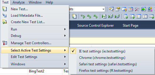 1) Within Visual Studio create multiple .testsettings files (or .testrunconfig files for VS 2008). You will want one file per browser you want to test.