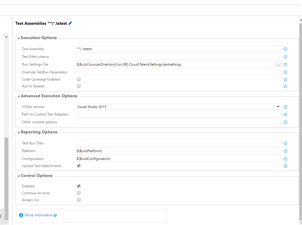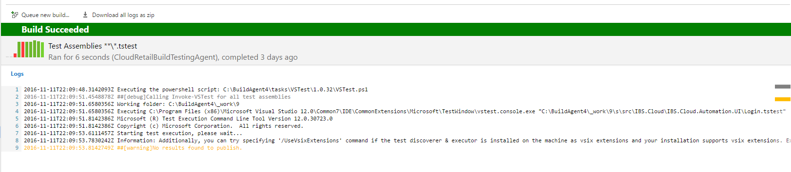 Hi I'm trying out a trial of test studio (along with the VS plugin) and I'm currently trying to get a test to run on a TFS build server. I've attached a screenshot of the settings for the step in my build. I'm going off a tutorial I read for running tests on TFS with MSBuild. Given the what the logs output after running the test step in the build, it looks like the test isn't actually running. Here is the command that TFS is running: