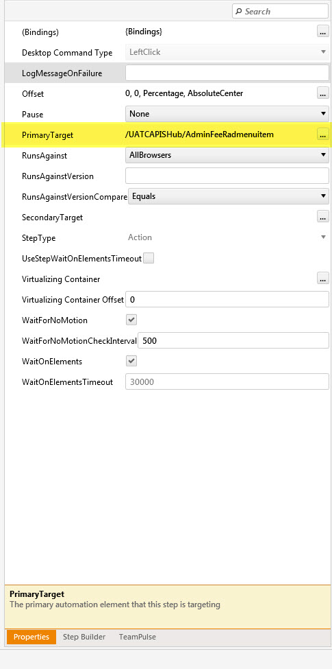 Okay, I have multiple environments (Dev, UAT, Stage and Production). Currently I am creating automated tests in our Dev environment. The idea is to use the same test to run in other environments. When I try it, I notice that nothing happens because the primary target for the element is different depending on the environment it is in. I've attached screenshots for examples, and each environment are accessed through different URLs (http://devapp/ and http://uatapp/). Is there a way to make this work? Or will I have to create a new test for each environment. Thanks in advance.