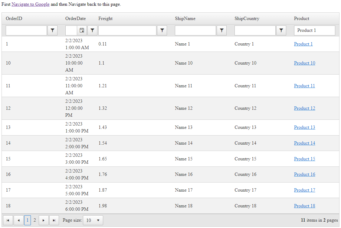 First <a href="https://www.google.com/">Navigate to Google</a> and then Navigate back to this page. <br /> <br /> <telerik:RadGrid ID="RadGrid1" runat="server" AllowPaging="True" AllowFilteringByColumn="true" Width="800px" OnNeedDataSource="RadGrid1_NeedDataSource" OnItemCommand="RadGrid1_ItemCommand" OnPreRender="RadGrid1_PreRender"> <MasterTableView AutoGenerateColumns="False" DataKeyNames="OrderID"> <Columns> <telerik:GridBoundColumn DataField="OrderID" DataType="System.Int32" FilterControlAltText="Filter OrderID column" HeaderText="OrderID" ReadOnly="True" SortExpression="OrderID" UniqueName="OrderID"> </telerik:GridBoundColumn> <telerik:GridDateTimeColumn DataField="OrderDate" DataType="System.DateTime" FilterControlAltText="Filter OrderDate column" HeaderText="OrderDate" SortExpression="OrderDate" UniqueName="OrderDate"> </telerik:GridDateTimeColumn> <telerik:GridNumericColumn DataField="Freight" DataType="System.Decimal" FilterControlAltText="Filter Freight column" HeaderText="Freight" SortExpression="Freight" UniqueName="Freight"> </telerik:GridNumericColumn> <telerik:GridBoundColumn DataField="ShipName" FilterControlAltText="Filter ShipName column" HeaderText="ShipName" SortExpression="ShipName" UniqueName="ShipName"> </telerik:GridBoundColumn> <telerik:GridBoundColumn DataField="ShipCountry" FilterControlAltText="Filter ShipCountry column" HeaderText="ShipCountry" SortExpression="ShipCountry" UniqueName="ShipCountry"> </telerik:GridBoundColumn> <telerik:GridHyperLinkColumn DataNavigateUrlFields="SupplyID" HeaderText="Product" SortExpression="Product" UniqueName="Product" DataNavigateUrlFormatString="/Pages/xxxxxx.aspx?ID={0}" DataTextField="Product" CurrentFilterFunction="Contains" AutoPostBackOnFilter="True" ShowFilterIcon="false"> </telerik:GridHyperLinkColumn> </Columns> </MasterTableView> </telerik:RadGrid>C#