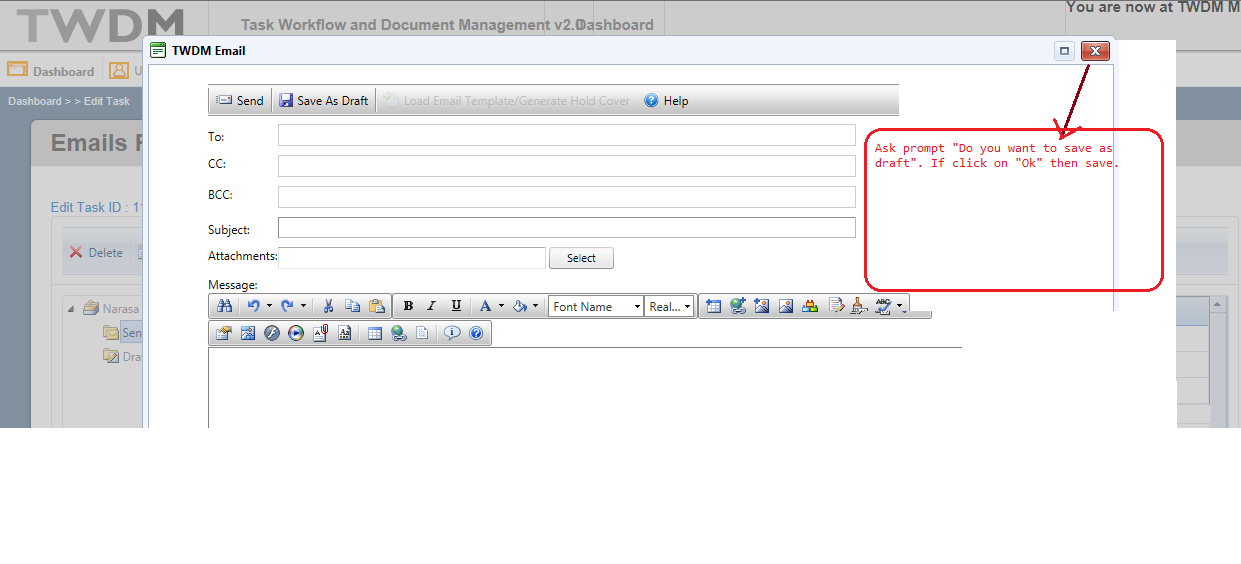 <telerik:RadWindowManager runat="Server" ID="RadWindowManager2" ShowContentDuringLoad="false" EnableViewState="false"> <Windows> <telerik:RadWindow runat="server" ID="EmailScreen" KeepInScreenBounds="true" Title="TWDM Email" OnClientBeforeClose="OnClientBeforeCloseEmailScreen" InitialBehaviors="Maximize" AutoSize="true" Width="1000px" Height="850px" ReloadOnShow="true" ShowContentDuringLoad="false" Modal="True" Behaviors="Close,Move,Resize,Maximize" VisibleStatusbar="true"> </telerik:RadWindow> </Windows> </telerik:RadWindowManager> function OnClientBeforeCloseEmailScreen(sender, eventArgs) { radconfirm('Do you want to save as draft?', confirmCallbackFn1, 400, 200, null, 'TWDM Confirm'); } function confirmCallbackFn1(arg) { if (arg) //the user clicked OK { __doPostBack("<%=hdnBtnSaveAsDraft.UniqueID %>", ""); } }' Showing email compose screen in Radwindow Popup here. function onButtonClicked(sender, args) { var commandName = args.get_item().get_commandName(); var qs = getQueryStrings(); var oManager = GetRadWindowManager().getWindowByName("EmailScreen"); if (commandName == "Compose") { window.radopen("ComposeMail.aspx?type=NewEmail&TaskNo=" + qs["TaskNo"] + "&Parent=" + qs["Parent"] + "", "EmailScreen"); }Find the attachment and Please help me on this..