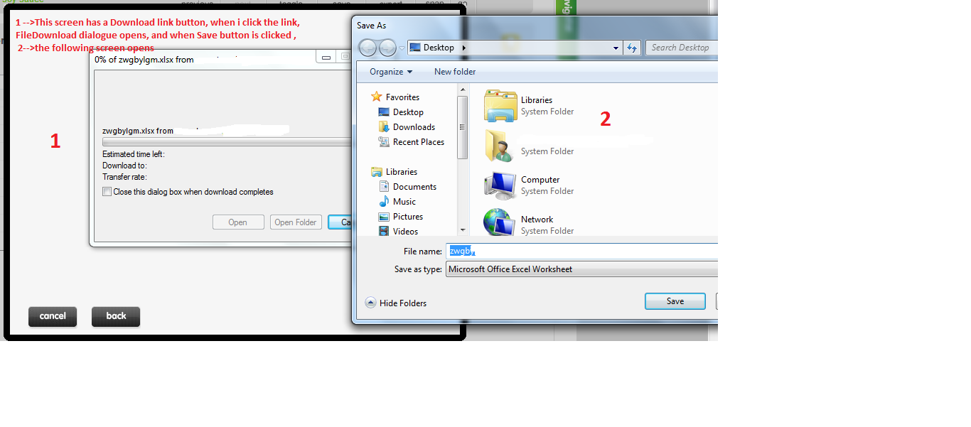 I am trying to handle a file download dialogue. Am using the below code.