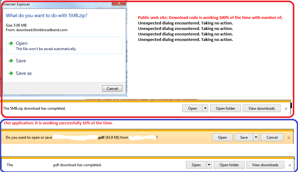 I have noticed, when I run the test on public web site, I got a different download dialog, but If I run the test on our application, I got toolbar type download. (please see the attached).