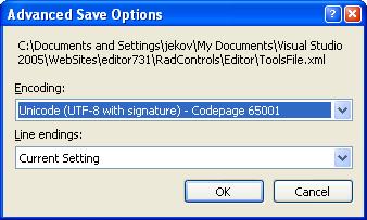Note that if you are using Telerik's code related to saving in the current file (http://www.telerik.com/support/kb/aspnet-ajax/editor/saving-radeditor-prometheus-content-directly-in-the-aspx-or-ascx-file-containing-the-editor.aspx) they don't specify utf8 in the StreamWriter: