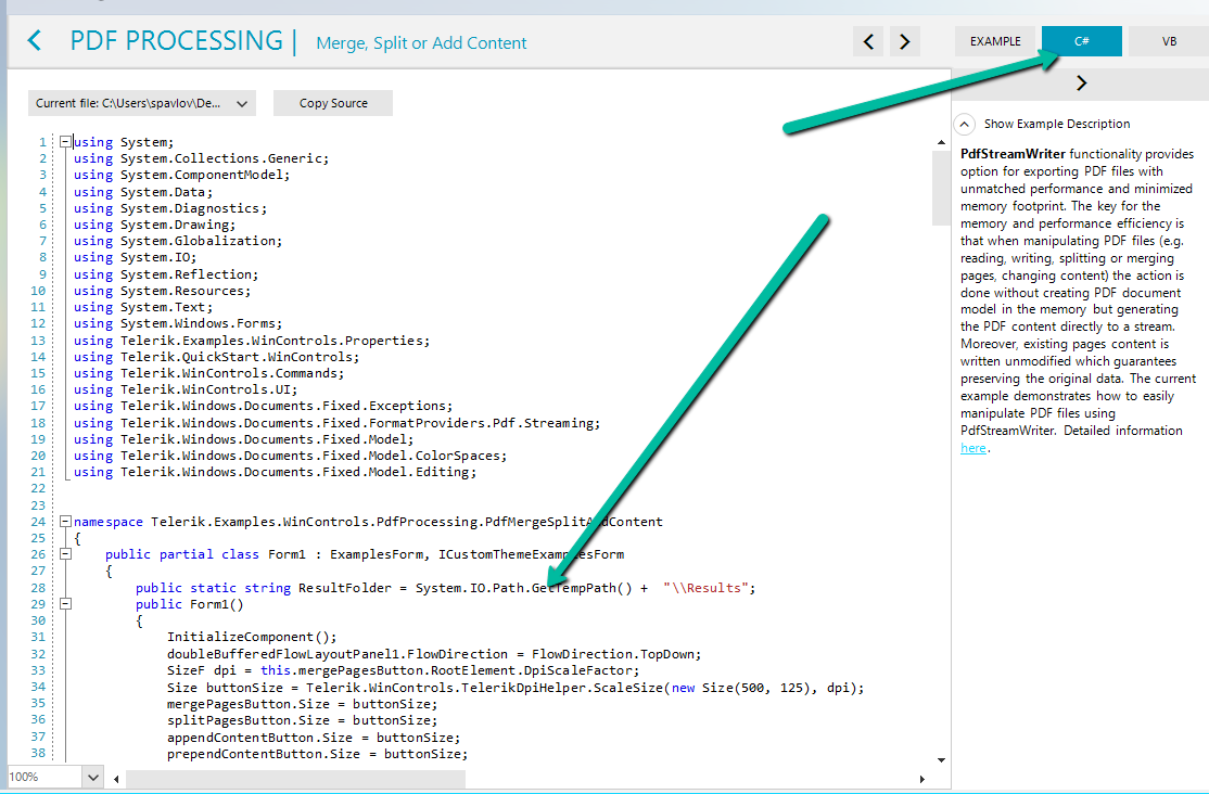 You can find more useful manipulation examples such as merging PDFs in our WinForms Demo application. To navigate to the proper demo select Explore all controls > PDF processing > Merge, Split or Add Content (see attached images). You can view the code by selecting your programming language in the top right corner (also attached image).
