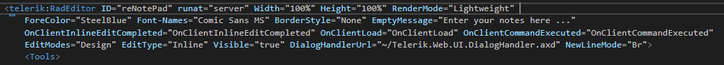 <div> <asp:Panel runat="server" ID="ToolbarHolder"> <div id="toolbarDiv" class="RadEditor reCustomContainer"> </div> </asp:Panel> </div> <telerik:RadEditor ID="reNotePad" runat="server" Width="100%" Height="100%" RenderMode="Lightweight" ForeColor="SteelBlue" Font-Names="Comic Sans MS" BorderStyle="None" EmptyMessage="Enter your notes here ..." OnClientInlineEditCompleted="OnClientInlineEditCompleted" OnClientLoad="OnClientLoad" OnClientCommandExecuted="OnClientCommandExecuted" EditModes="Design" EditType="Inline" Visible="true" DialogHandlerUrl="~/Telerik.Web.UI.DialogHandler.axd" NewLineMode="Br"> <Tools> <telerik:EditorToolGroup dockingzone="toolbarDiv"> <telerik:EditorTool Name="Undo" /> <telerik:EditorTool Name="Redo" /> <telerik:EditorSeparator /> <telerik:EditorTool Name="Bold" /> <telerik:EditorTool Name="Italic" /> <telerik:EditorTool Name="Underline" /> <telerik:EditorSeparator /> <telerik:EditorTool Name="ForeColor" /> <telerik:EditorTool Name="BackColor" /> <telerik:EditorSeparator /> <telerik:EditorTool Name="InsertOrderedList" /> <telerik:EditorTool Name="InsertUnorderedList" /> <telerik:EditorSeparator /> <telerik:EditorTool Name="InsertHorizontalRule" /> <telerik:EditorSeparator /> <telerik:EditorTool Name="Indent" /> <telerik:EditorTool Name="Outdent" /> <telerik:EditorSeparator /> <telerik:EditorTool Name="InsertLink" /> <telerik:EditorSeparator /> <telerik:EditorTool Name="JustifyLeft" /> <telerik:EditorTool Name="JustifyCenter" /> <telerik:EditorTool Name="JustifyRight" /> <telerik:EditorTool Name="JustifyFull" /> </telerik:EditorToolGroup> </Tools> </telerik:RadEditor>Here is the css used to style this Editor: