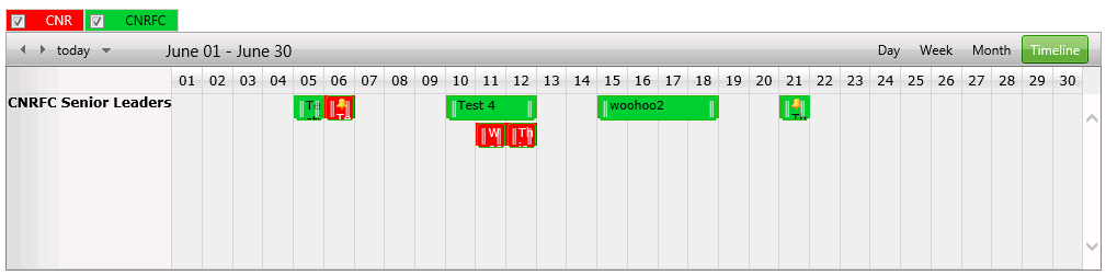 Actually I got this working really well by writing a custom provider that uses a SharePoint list for the appointments and another one for the resource types. I even created a custom form for the resource list so that you can choose a color and background style. The results are nice but just one thing I would like to do. In the attached screen capture I want to align the secondary groups (CNR, CNRFC) into their own row still inside the main group (Senior Leaders). There are going to be more secondary and main groups. Basically in this image I want all the red events in 1 row and green in another and will add more.