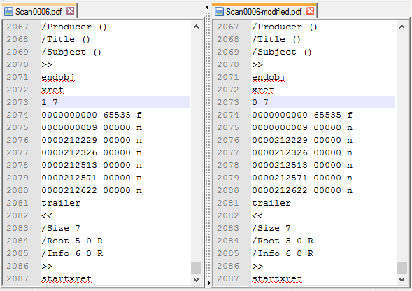 Okay thanks a lot, I was able to change the value of the start in index and the PDF appears! I noticed that this issue occurs in all PDF's created by our scanner, so I'm now changing it through the code behind of our application.