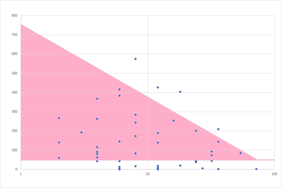 I am trying to add an area of best fit to a standard scatter plot: I have one set of data points, and two equations for lines of best fit. The desired result is a scatter plot of the data points with a shaded area between the two lines of best fit.