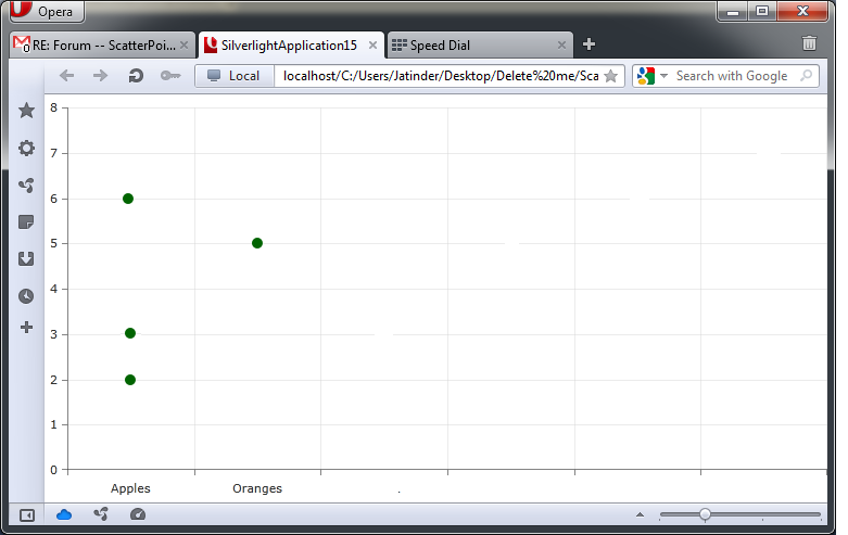 <chart:RadCartesianChart Palette="Metro"> <chart:RadCartesianChart.HorizontalAxis> <chartview:CategoricalAxis Title="Fruits"/> </chart:RadCartesianChart.HorizontalAxis> <chart:RadCartesianChart.VerticalAxis> <chartview:LinearAxis Title="Some Value"/> </chart:RadCartesianChart.VerticalAxis> <chartview:ScatterPointSeries ItemsSource="{Binding Items}" x:Name="series" XValueBinding="Item1" YValueBinding="Item2"/> </chart:RadCartesianChart>6 Answers, 1 is accepted