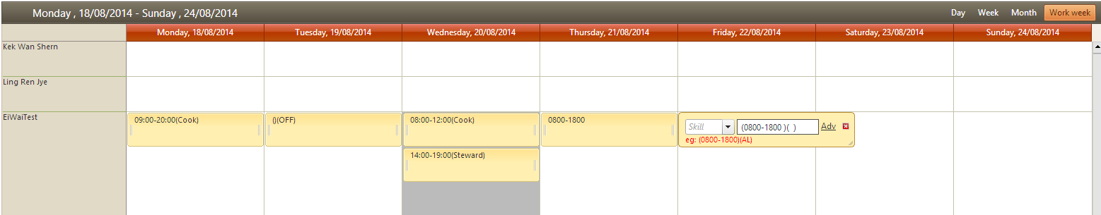 protected void Page_Load(object sender, EventArgs e) { if (!IsPostBack) { RadScheduler1.SelectedDate = DateTime.Now; RadScheduler1.GroupBy = "Employee"; RadScheduler1.GroupingDirection = GroupingDirection.Vertical; //Bind Resource ResourceTypeCollection coll = RadScheduler1.ResourceTypes; ResourceType emp = coll.FindByName("Employee"); List<tbl_EmployeeMaster> empList = GetEmployeeByLocationForScheduleResource(ConfigurationManager.ConnectionStrings["TestConnectionString"].ToString()); emp.DataSource = empList; Bind(DateTime.Now); } } private void Bind(DateTime dt) { string connStr = ConfigurationManager.ConnectionStrings["TestConnectionString"].ToString(); //Bind Schedule List<tbl_Appointment> sch_list = GetScheduleByDateFor7Days(dt, connStr); RadScheduler1.DataSource = sch_list; RadScheduler1.Rebind(); RadScheduler1.AllowInsert = true; } protected void RadScheduler1_ResourceHeaderCreated(object sender, ResourceHeaderCreatedEventArgs e) { Label txtLabel = e.Container.FindControl("lblText") as Label; txtLabel.Text = e.Container.Resource.Text; } protected void RadScheduler1_DataBound(object sender, EventArgs e) { } protected void RadScheduler1_NavigationCommand(object sender, SchedulerNavigationCommandEventArgs e) { if (e.Command == SchedulerNavigationCommand.SwitchToMonthView) { RadScheduler1.RowHeight = Unit.Pixel(50); } else if (e.Command == SchedulerNavigationCommand.SwitchToTimelineView) { RadScheduler1.RowHeight = Unit.Pixel(50); } else { RadScheduler1.RowHeight = Unit.Pixel(50); } } protected void RadScheduler1_FormCreated(object sender, SchedulerFormCreatedEventArgs e) { Session["ContainerMode"] = e.Container.Mode; if (e.Container.Mode == SchedulerFormMode.Insert) { RadTextBox txtTitleTextBox = e.Container.FindControl("TitleTextBox") as RadTextBox; if (txtTitleTextBox.Text.Length <= 0) { txtTitleTextBox.Text = "( )( )"; } } } protected void RadScheduler1_AppointmentInsert(object sender, AppointmentInsertEventArgs e) { string desc = e.Appointment.Description; string timing = e.Appointment.Subject; Resource emp_resource = e.Appointment.Resources.GetResourceByType("Employee"); //Resource emp_resource = RadScheduler1.Resources.GetResourceByType("Employee"); string employeeID = string.Empty; RadScheduler schedulerTemp = sender as RadScheduler; if (emp_resource != null) employeeID = emp_resource.Key.ToString(); else { emp_resource = schedulerTemp.Resources.GetResourceByType("Employee"); employeeID = emp_resource.Key.ToString(); } char[] splitter = new char[] { '-' }; //int dayChange = DayChangeBLL.GetDayChange(Session["CurrentUserCompanyID"].ToString() // , ConfigurationManager.ConnectionStrings["AnytimeConnectionString"].ToString(), employeeID); if (!timing.Contains("(") || !timing.Contains(")")) { e.Cancel = true; lblMsg.Text = " Input Format Wrong! Do not delete parenthesis."; RadAjaxManager.GetCurrent(Page).ResponseScripts.Add(String.Format("$find('{0}').show();", rWAlert.ClientID)); } else { string locID = string.Empty; string reasonCode = string.Empty; string skillid = string.Empty; string skilltxt = string.Empty; string inoutStr = e.Appointment.Subject; string input = inoutStr.Trim(); string[] output = input.Split(new char[] { '(', ')' }); if (output.Length != 11) { e.Cancel = true; lblMsg.Text = " Input Format Wrong! Do not delete parenthesis."; RadAjaxManager.GetCurrent(Page).ResponseScripts.Add(String.Format("$find('{0}').show();" , rWAlert.ClientID)); } else { inoutStr = output[1].Trim(); reasonCode = output[3].Trim().ToUpper(); skillid = output[5].Trim(); skilltxt = output[7].Trim(); employeeID = output[9].Trim(); } if (inoutStr.Length > 0) { // Here I will save my data to Database string msg = InsertOrUpdateSchedule(oTblSchedule , ConfigurationManager.ConnectionStrings["TestConnectionString"].ToString()); if (msg.Equals("Save") || msg.Equals("Update")) { RadScheduler1.DataSource = null; Bind(DateTime.Now); } } } }From the above sample application, data will be save into Database and show inside scheduler when I use Tab key. But I would like it to be save and show on scheduler when I click on another timeslot after I key in data. Currently, I only save in database but not shown on scheduler unless I refresh page. Will that be possible? Thank you for your help.