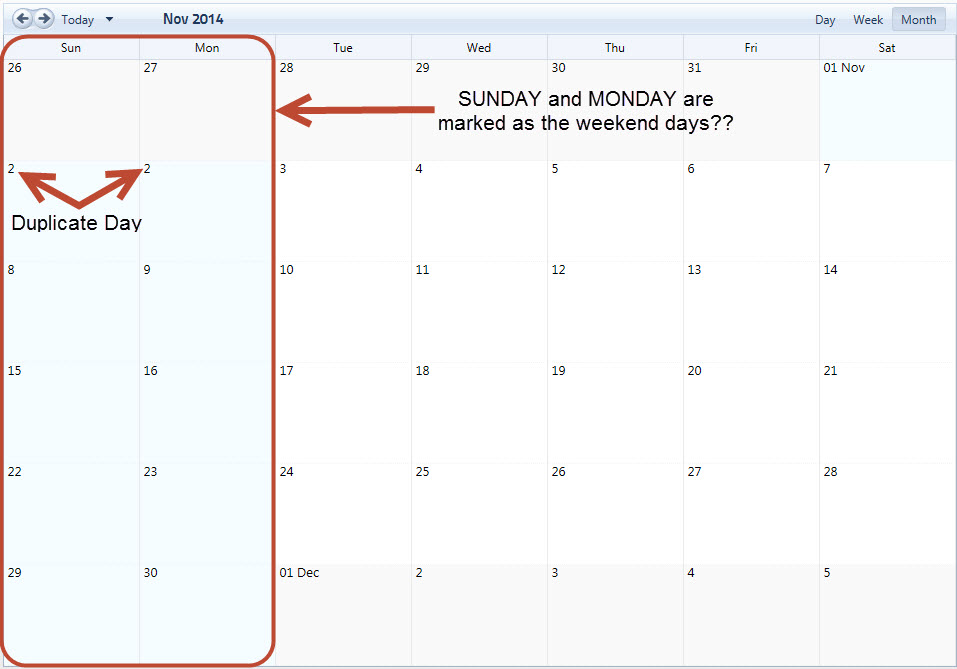 Here is my issue, while testing I found a weird bug in the calendar display, for Novermber 2014. The date "2" is duplicated twice, shifting all the other days in the calendar, and then is shows SUNDAY and MONDAY as the "weekend" days, instead of SATURDAY and SUNDAY. Now all the events added show up on the correct BOX, but the boxes have the wrong DAY on them, so it look like the events added are one day prior to the actual date. See the image below...