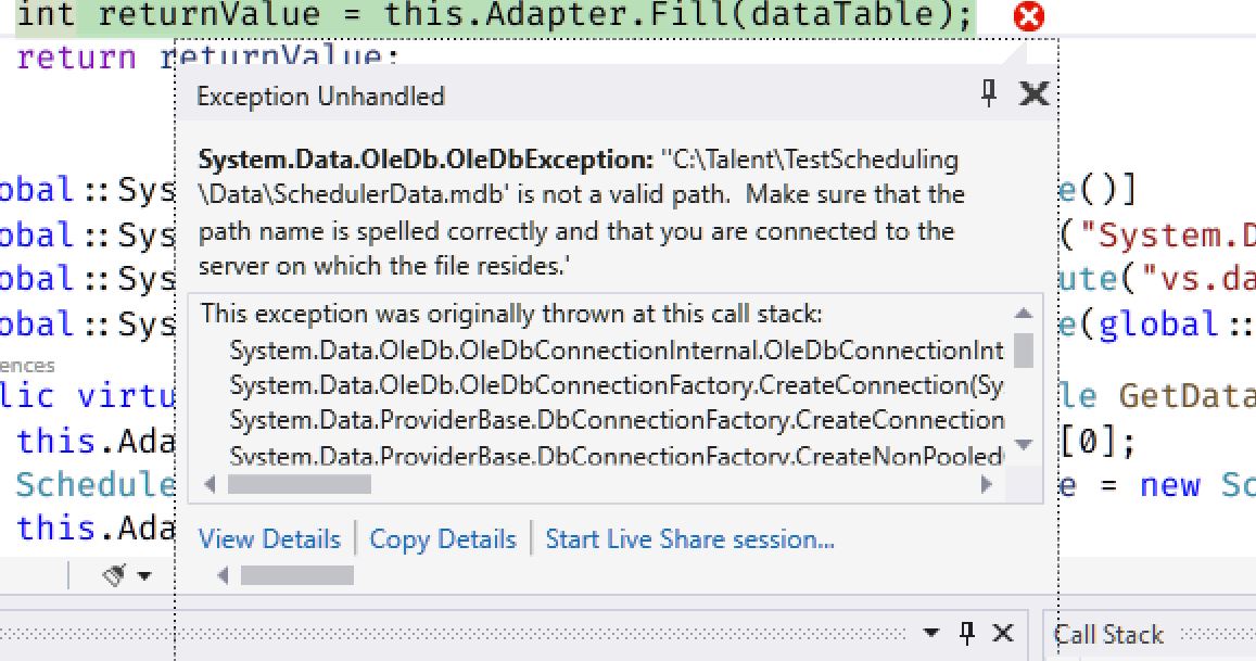 I follow the example Data Bind Walkthrough using Access database. It works fine when I first select a database from a specific directory in the setup and runs the application. Whereas, If I moved the database to another directory folder. I got an exception when I ran my application again. See attached error. How can I make it looks into the correct database folder. Any help would be appreciated.