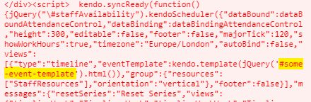 01.@(Html.Kendo().Scheduler<TelerikScheduleViewModel>()02. .Name("staffAvailability")03. .Height(300)04. .HtmlAttributes(new { data_bind = "bindDate:start, filterBy:Staff, visible:Staff.length" })05. .Timezone("Europe/London")06. .Mobile(MobileMode.Auto)07. .MajorTick(120)08. .Editable(false)09. .ShowWorkHours(true)10. .Footer(false)11. .AutoBind(false)12. .Views(views =>13. {14. views.TimelineView(timeline =>15. {16. timeline.Footer(false);17. timeline.Groups(group => group.Resources("StaffResources").Orientation(SchedulerGroupOrientation.Vertical));18. timeline.EventTemplateId("some-event-template");19. });20. 21. })22. .DataSource(dataSource => dataSource23. .ServerOperation(false)24. .Events(e => e.Change("staffOnChange").RequestStart("staffRequestStart"))25. .Read(read => read.Action("ListStaffSessions", "Calendar").Data("getStaffAttendance"))26. ).Events(e => e.DataBound("dataBoundAttendanceControl").DataBinding("dataBindingAttendanceControl"))27. )