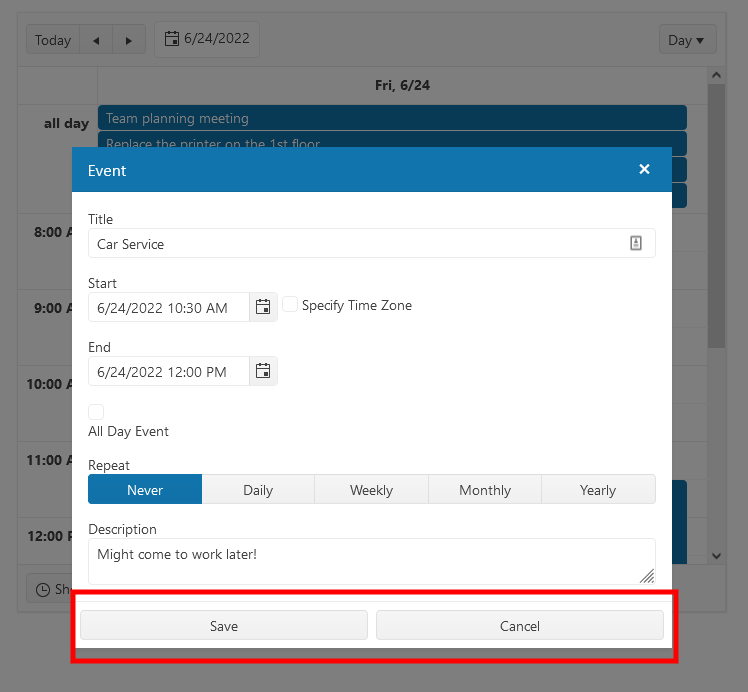 I have a Scheduler component in my app and I have added a custom form for editing the values of the Scheduler events. This all works fine. The only thing I couldn't figure out is how to influence the "save" and "cancel" buttons of the Scheduler form (see attached screenshot from your example app).