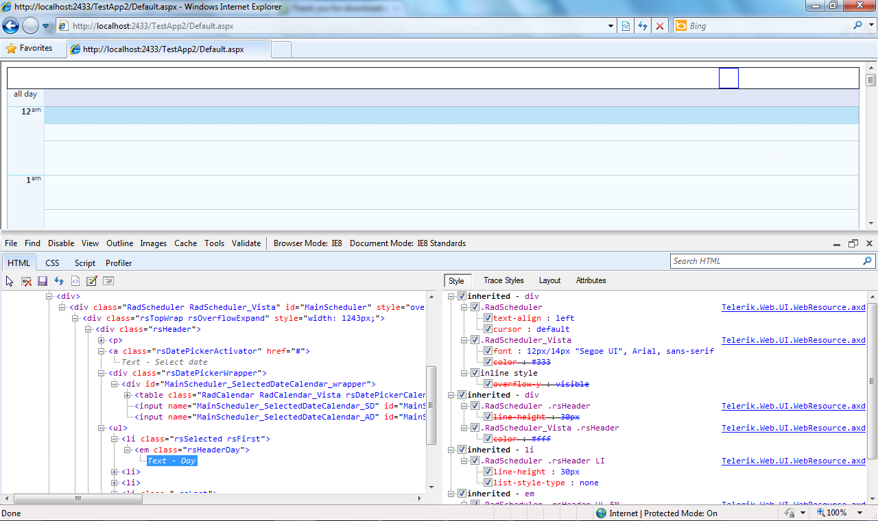 At run time, my Rascheduler displays a blank header (please see attachment) (on Windows 7). I'm using Telerik version 2011.2.712.40 with VisualStudio 2010. In the designer, the header is shown as expected.