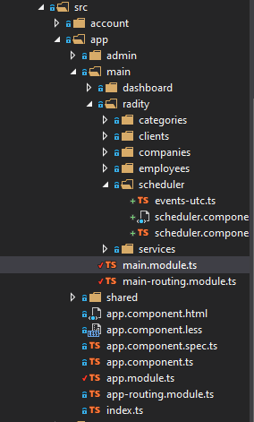 All packages are set up. After that I imported the SchedulerModule to the app.module.ts file in src/app folder. And then I created a page called 'Scheduler' and created html and ts file called scheduler.component.* and also put that folder events.utc.ts file as in example. My scheduler.component.ts file has these codes: