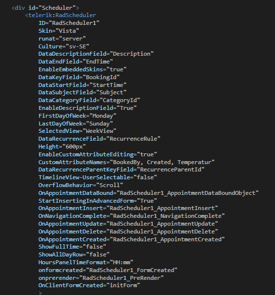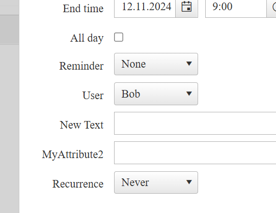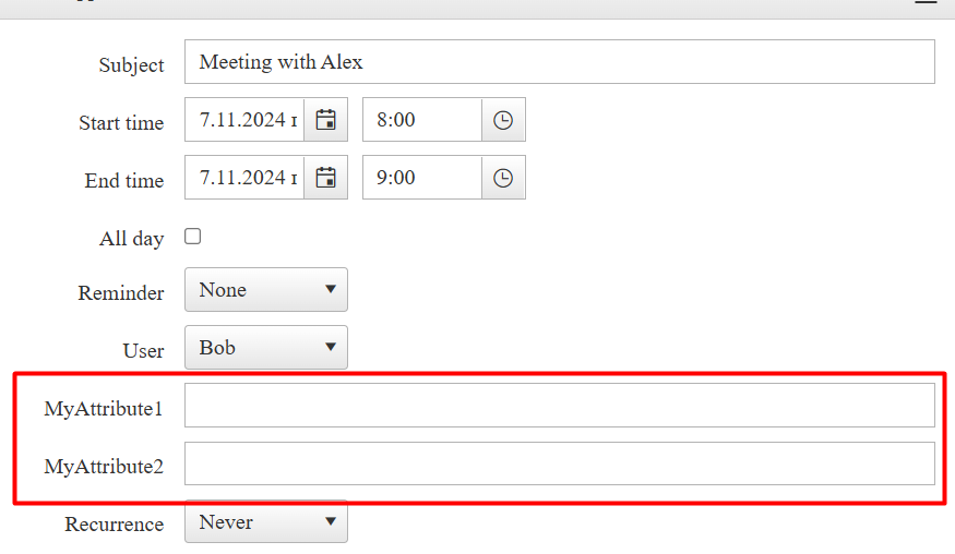 When creating an appointment in scheduler we have added three custom attributes, BookedBy, Created and Temperatur.