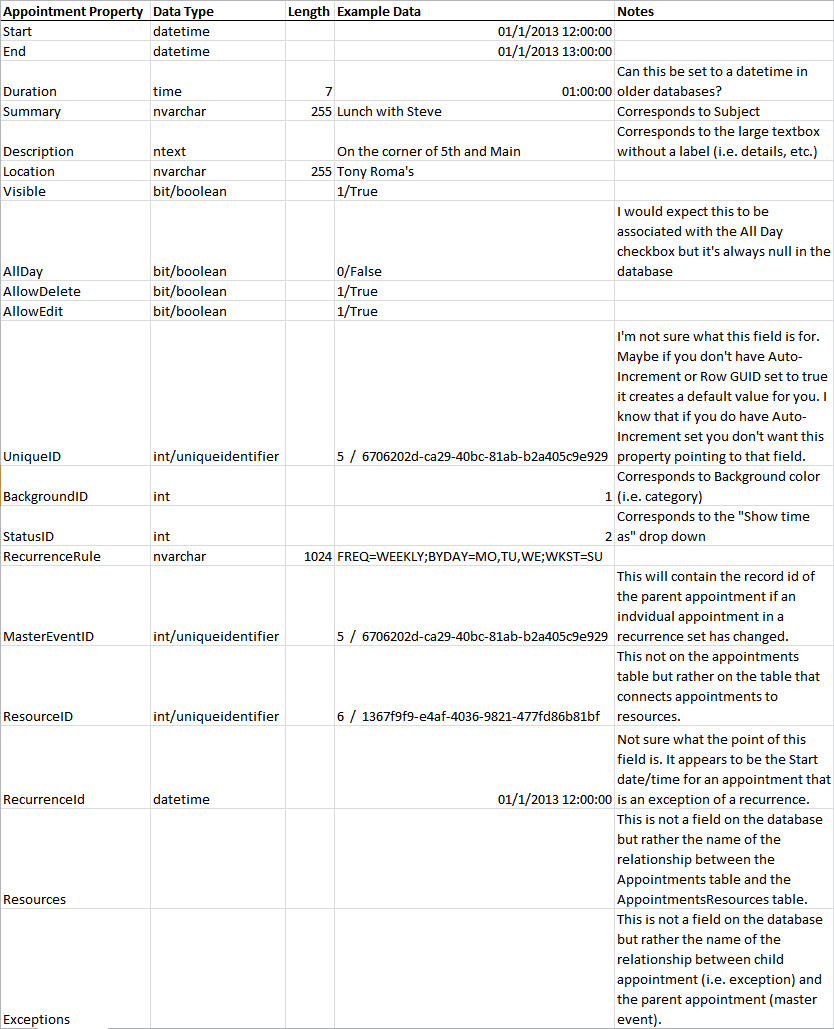 | RecurrenceId | datetime | 01/1/2013 12:00:00 | Not sure what the point of this field is. It appears to be the Start date/time for an appointment that is an exception of a recurrence. | |