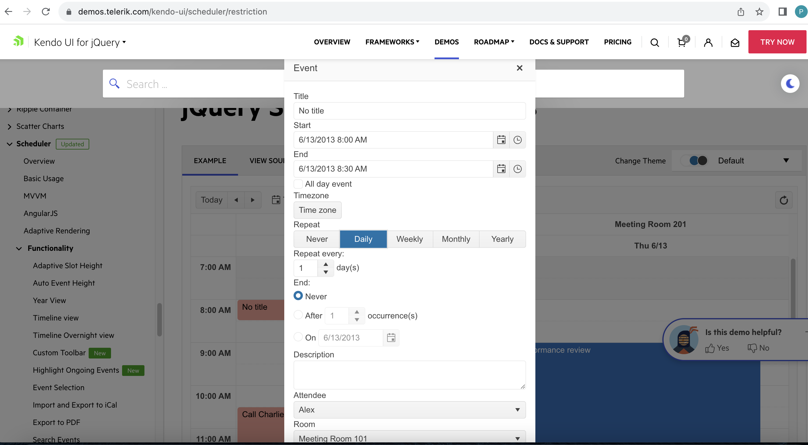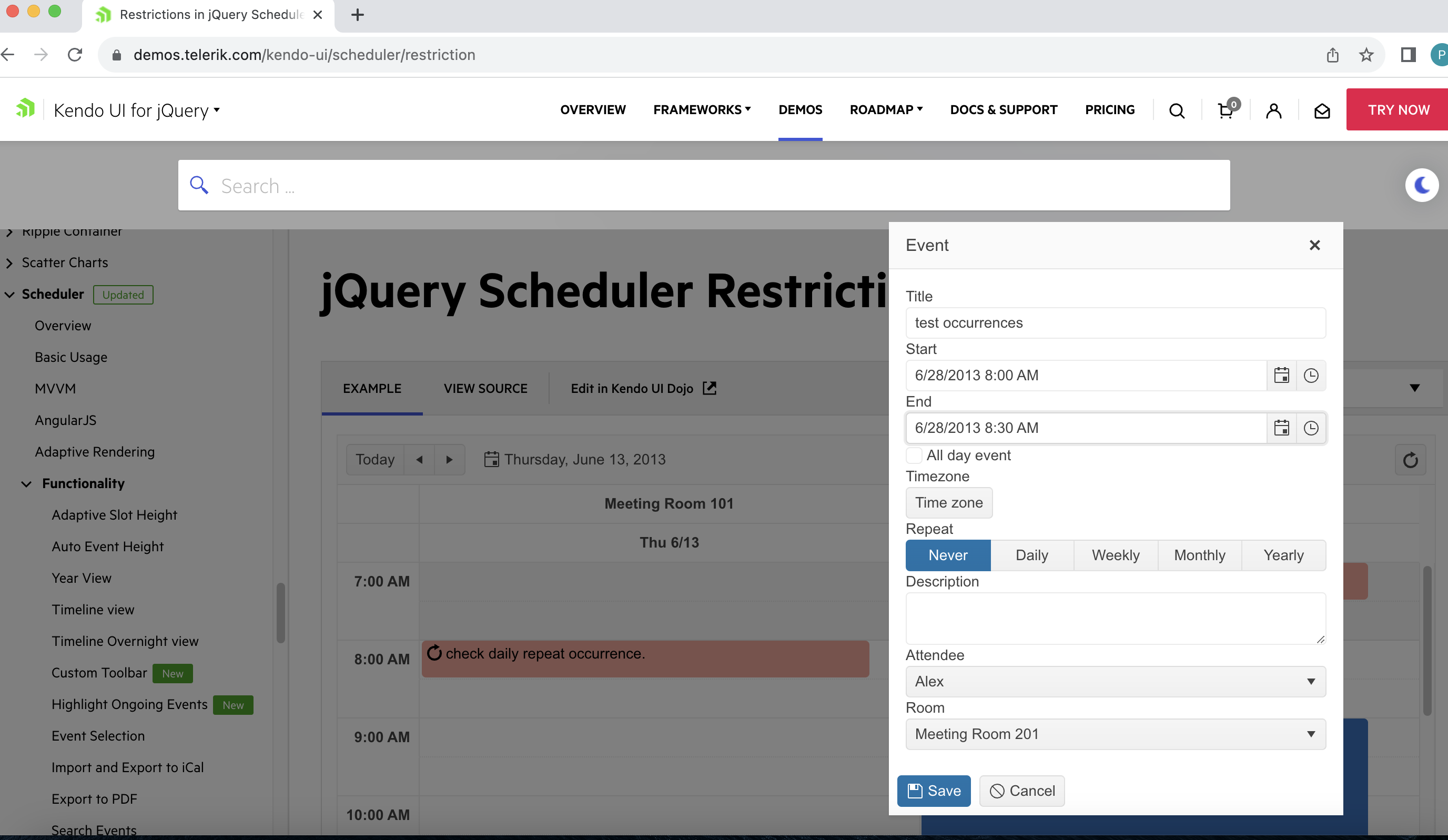 I have tested the demo Scheduler Restriction and find its not giving accurate result when we manipulate date and time. I have added event with daily repeat occurrence (PFA the same 1.png) and open another event window with different date and time and change it manually with different date but same time whose already added (PFA the same 2.png) , hit save then its added successfully. (PFA the same 3.png) which is wrong according to this behaviour. its works fine when we open popup window on same date but only change time manually, problem is with changing date and time both to different ones. Hope you understand this. please resolve this asap.