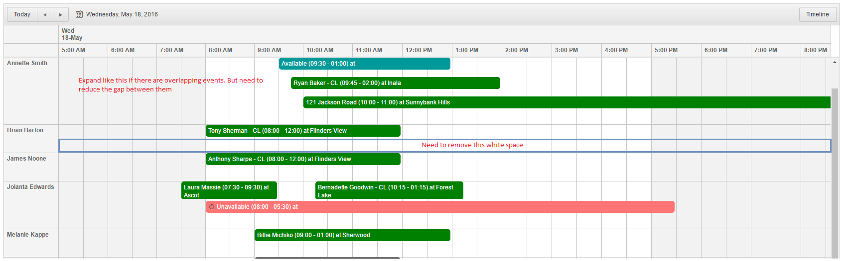 I have a scheduler with timeline view and need to set the row height dynamically. If I set the default height via css the auto expand won't work but if it's not there are to many white space inside the row. Please check image attached to clarify my mind. And is it possible to set alternate row here?