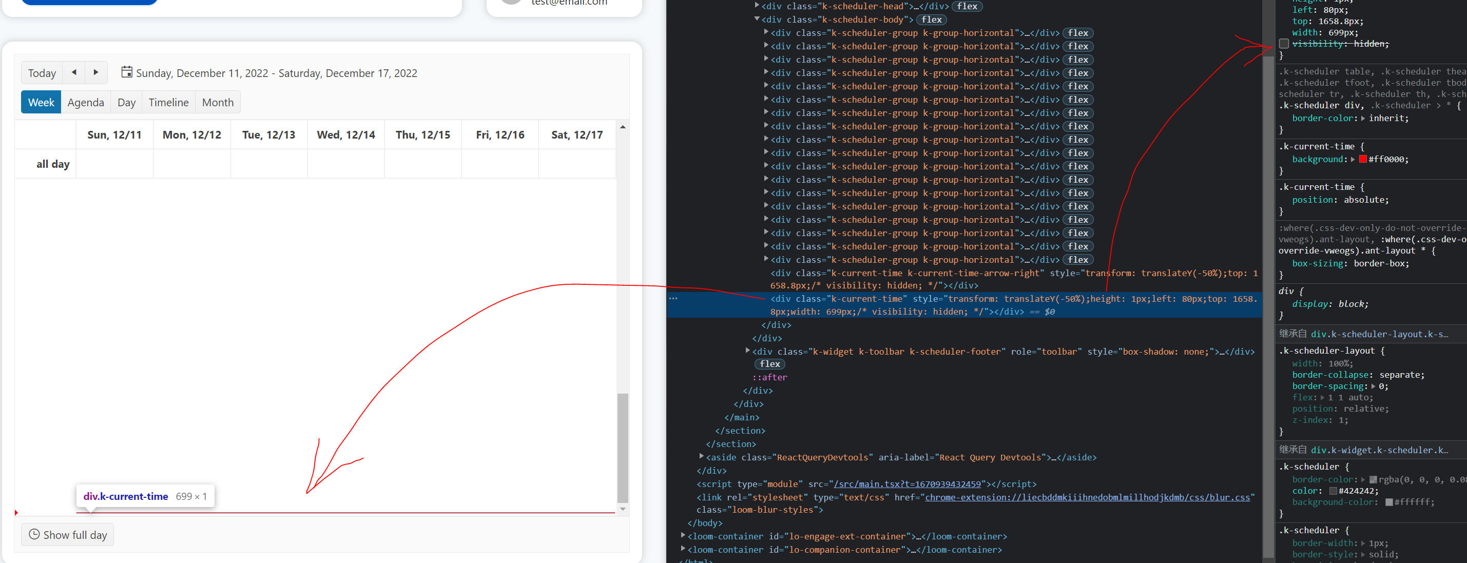 The reason is that the current time indicator has a "top" attribute, it becomes a very large value in the evening, which expands the height of its container. So the solution could be deleting that "top" attribute when clicking "Show business hours".