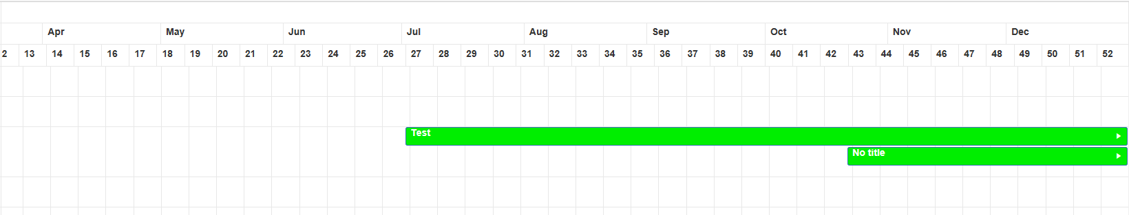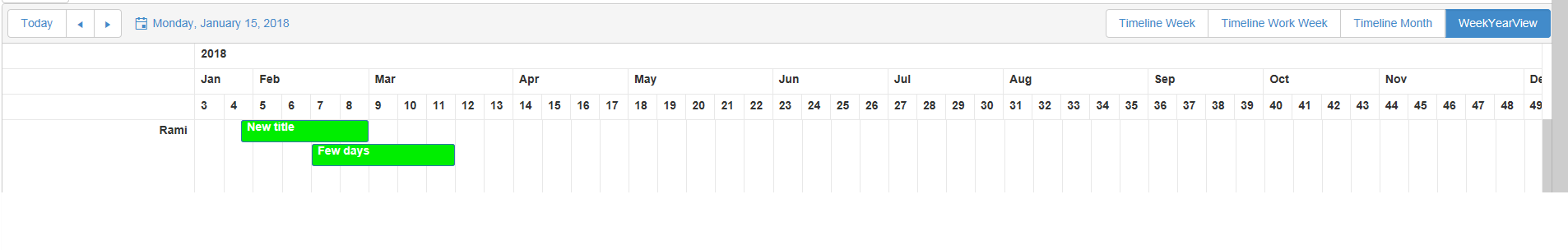 var WeeksTimelineGroupedView = kendo.ui.scheduler.TimelineGroupedView.extend({ _addContent: function (dates, columnCount, groupsCount, rowCount, start, end, slotTemplate, isVerticalGrouped) { // console.log('_addContent'); var view = this._view; var html = ''; for (var rowIdx = 0; rowIdx < rowCount; rowIdx++) { html += '<tr>'; for (var groupIdx = 0; groupIdx < groupsCount; groupIdx++) { for (idx = 0; idx < dates.length; idx += 7) { html += '<td> </td>'; } } html += '</tr>'; } return html; }, _addTimeSlotsCollections: function (groupCount, tableRows) { // console.log("_addTimeSlotsCollections"); var view = this._view; for (var groupIndex = 0; groupIndex < groupCount; groupIndex++) { var cells = tableRows[groupIndex].children; var day = view._startDate; var ci = 0; var collection = view.groups[groupIndex].getTimeSlotCollection(0); while (day < view._endDate) { cells[ci].setAttribute('role', 'gridcell'); cells[ci].setAttribute('aria-selected', false); collection.addTimeSlot(cells[ci], day, kendo.date.addDays(day, 7), true); day = kendo.date.addDays(day, 7); ci++; } } }, // don't hide headers _hideHeaders: function () { // var view = this._view; // view.timesHeader.find('table tr:last').hide(); // view.datesHeader.find('table tr:last').hide(); }});// weeknumber function from https://stackoverflow.com/questions/6117814/get-week-of-year-in-javascript-like-in-php// because kendo.date.weekInYear is returning invalid resultsfunction getWeekInfo(d) { // Copy date so don't modify original d = new Date(Date.UTC(d.getFullYear(), d.getMonth(), d.getDate())); // Set to nearest Thursday: current date + 4 - current day number // Make Sunday's day number 7 d.setUTCDate(d.getUTCDate() + 4 - (d.getUTCDay() || 7)); // Get first day of year var yearStart = new Date(Date.UTC(d.getUTCFullYear(), 0, 1)); // Calculate full weeks to nearest Thursday var weekNo = Math.ceil((((d - yearStart) / 86400000) + 1) / 7); // Return week number, month and year return { week: weekNo, month: d.getMonth(), year: d.getUTCFullYear() };};var WeekYearView = kendo.ui.TimelineView.extend({ _getGroupedView: function () { // console.log('_getGroupedView'); return new WeeksTimelineGroupedView(this); }, name: "WeekYearView", options: { columnWidth: 35, currentTimeMarker: false, height: 700 }, previousDate: function () { var s = this.startDate(); return kendo.date.dayOfWeek(kendo.date.addDays(s, -30), 1, -1); }, // advance by.... one month? nextDate: function () { var s = this.startDate(); return kendo.date.dayOfWeek(kendo.date.addDays(s, 30), 1, -1); }, // make it one year, from the monday starting with selected date calculateDateRange: function () { // console.log('calculateDateRange'); var selectedDate = this.options.date, start = kendo.date.dayOfWeek(selectedDate, 1, -1), end = kendo.date.dayOfWeek(new Date(selectedDate.getFullYear() + 2, selectedDate.getMonth()), 1, 1), dates = []; // end = kendo.date.dayOfWeek(new Date(selectedDate.getFullYear(), selectedDate.getMonth() + 4), 1, 1), dates = []; while (start < end) { dates.push(start); start = kendo.date.nextDay(start); } this._render(dates); }, // make proper slots _calculateSlotRanges: function () { // console.log('_calculateSlotRanges'); var dates = this._dates; var slotStartTime = this.startTime(); var slotEndTime = this.endTime(); slotEndTime = kendo.date.getMilliseconds(slotEndTime); slotStartTime = kendo.date.getMilliseconds(slotStartTime); if (slotEndTime === slotStartTime) { slotEndTime += kendo.date.MS_PER_DAY - 1; } else if (slotEndTime < slotStartTime) { slotEndTime += kendo.date.MS_PER_DAY; } var slotRanges = []; // week long slots? for (var i = 0; i < dates.length; i += 7) { var rangeStart = kendo.date.getDate(dates[i]); kendo.date.setTime(rangeStart, slotStartTime); var rangeEnd = kendo.date.getDate(dates[i]); kendo.date.setTime(rangeEnd, slotEndTime); slotRanges.push({ start: kendo.date.toUtcTime(rangeStart), end: kendo.date.toUtcTime(rangeEnd) }); } this._slotRanges = slotRanges; }, _layout: function (dates) { // console.log('_layout'); var columns = []; var that = this; var rows = [{ text: that.options.messages.defaultRowText }]; var groupedView = that._groupedView; /* var weekNumTemplate = kendo.template('<span class=\'k-link k-nav-day\'>#=kendo.date.weekInYear(date)#</span>'); var monthNumTemplate = kendo.template('<span class=\'k-link k-nav-day\'>#=kendo.format(\'{0:MMM}\', date)#</span>'); var yearNumTemplate = kendo.template('<span class=\'k-link k-nav-day\'>#=kendo.format(\'{0:yyyy}\', date)#</span>'); var weekNumTemplate = kendo.template('<span class=\'k-link k-nav-day\'>#=getWeekInfo(date).week#</span>'); var monthNumTemplate = kendo.template('<span class=\'k-link k-nav-day\'>#=getWeekInfo(date).month#</span>'); var yearNumTemplate = kendo.template('<span class=\'k-link k-nav-day\'>#=getWeekInfo(date).year#</span>');*/ // loop months over weeks for (var idx = 0; idx < dates.length; idx++) { var info = getWeekInfo(dates[idx]); // has year column already? for (var yIdx = 0; yIdx < columns.length; yIdx++) { if (columns[yIdx].yearNum == info.year) break; } if (yIdx >= columns.length) { var yr = { // text: yearNumTemplate({ date: dates[idx] }), text: info.year, className: 'k-slot-cell', columns: [], weeks: [], yearNum: info.year, colspan: 1 }; columns.push(yr); yIdx = columns.length - 1; } else { columns[yIdx].colspan++; } // has month column already? for (var mIdx = 0; mIdx < columns[yIdx].columns.length; mIdx++) { if (columns[yIdx].columns[mIdx].monthNum == info.month) break; } if (mIdx >= columns[yIdx].columns.length) { var mn = { //get some localization here please text: new Date(2018, info.month, 1).toLocaleString("en-us", { month: "short" }), className: 'k-slot-cell', columns: [], monthNum: info.month, colspan: 1 }; columns[yIdx].columns.push(mn); mIdx = columns[yIdx].columns.length - 1; } else { columns[yIdx].columns[mIdx].colspan++; } // has timeslot already? for (var wIdx = 0; wIdx < columns[yIdx].weeks.length; wIdx++) { if (columns[yIdx].weeks[wIdx] == 