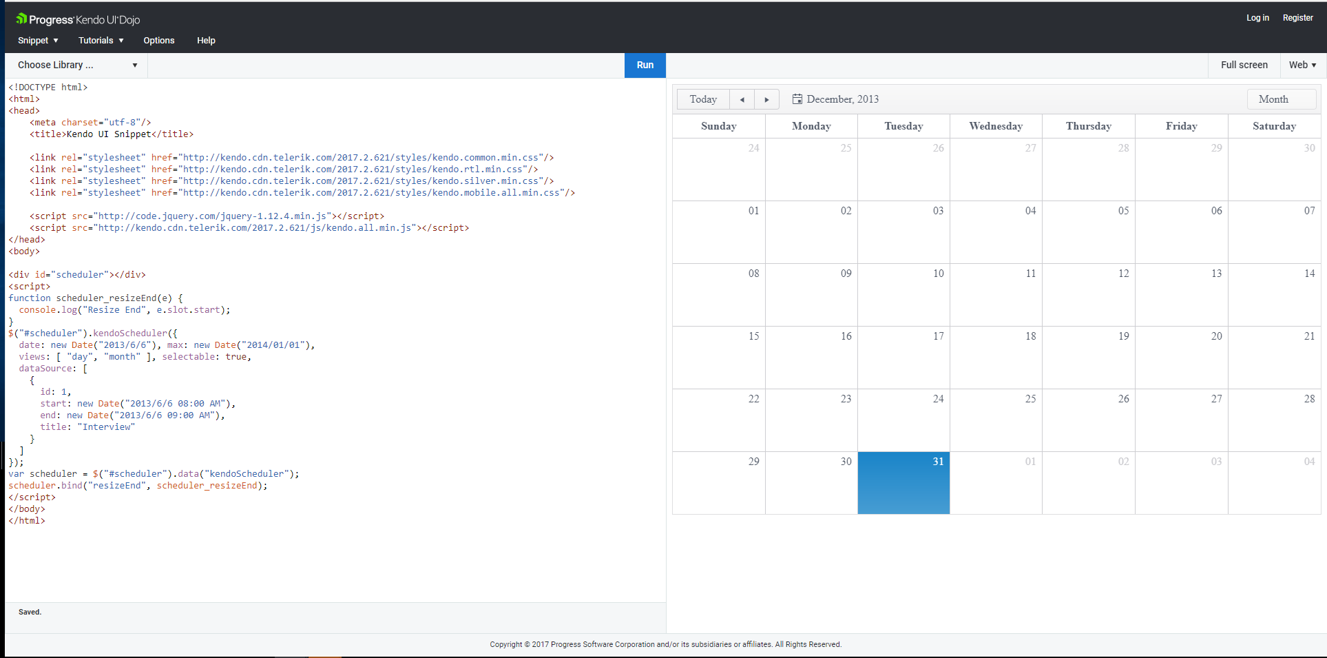 The problem is in month view: when i move manually (from the keyboard) the selection over the maximum date (to go into another cell/day) the all window block and i can do anything ,and there is no error.. so it is a kendo bug this? Or is a way to prevent this?