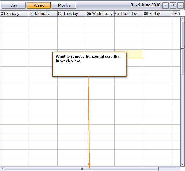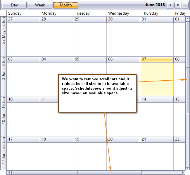I am able to remove the horizontal scrollbar in MonthViewDefinition with setting the MaxTimeRulerExtent and MinTimeRulerExtent properties and also it adjust its size as well.