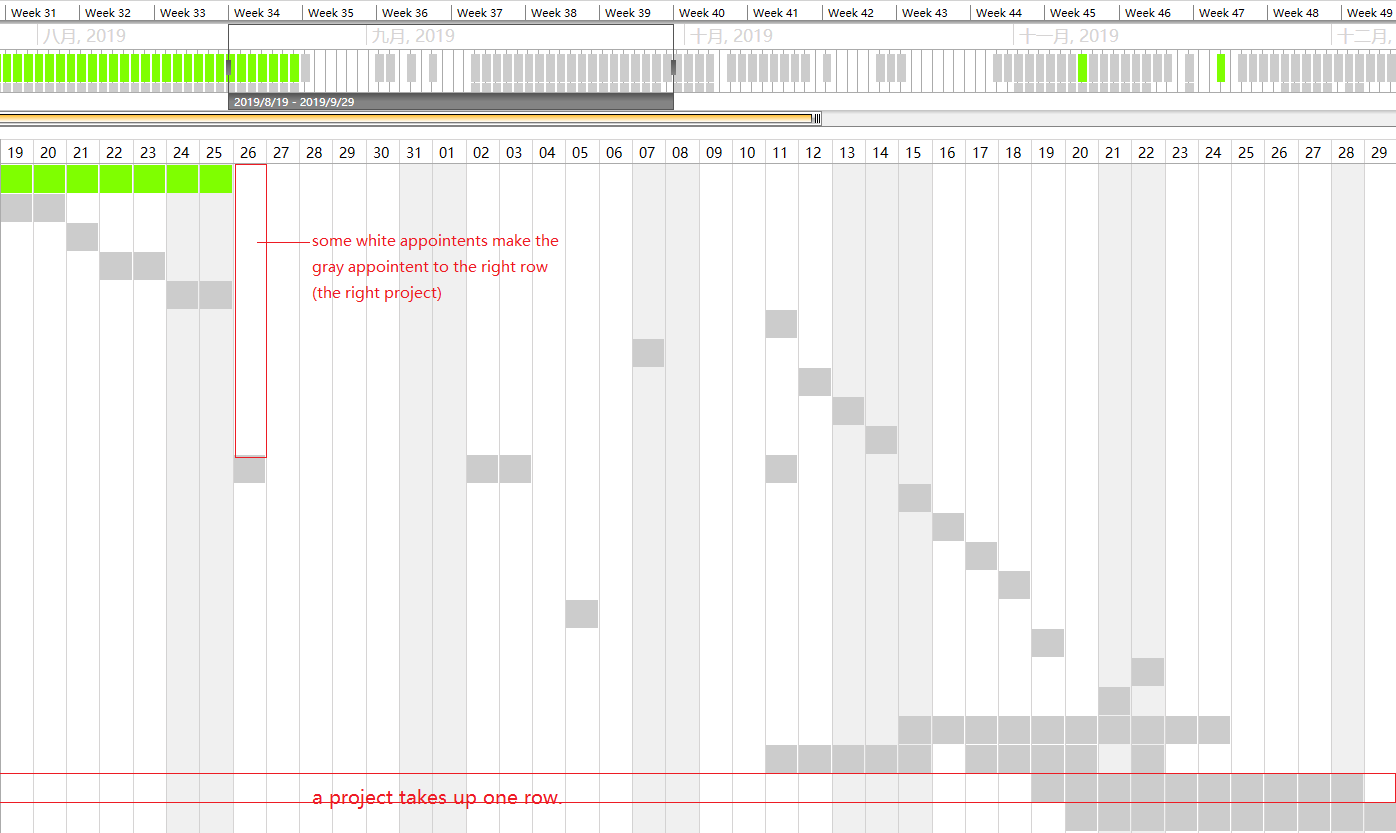 In 001.png,a project with lots of color blocks on different days takes up one row, and diffierent color block means different state.