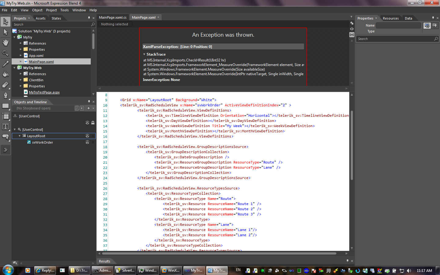 However the design view of expression blend 4 shows "An Exception was thrown"