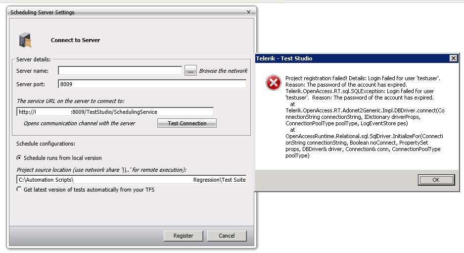 I have Telerik Test Studio [Version: 2012.2.1420] installed on Windows Server 2008 R2 OS. I am facing a weird issue of scheduling with the application. i have SQL Express Version [2012] installed too.