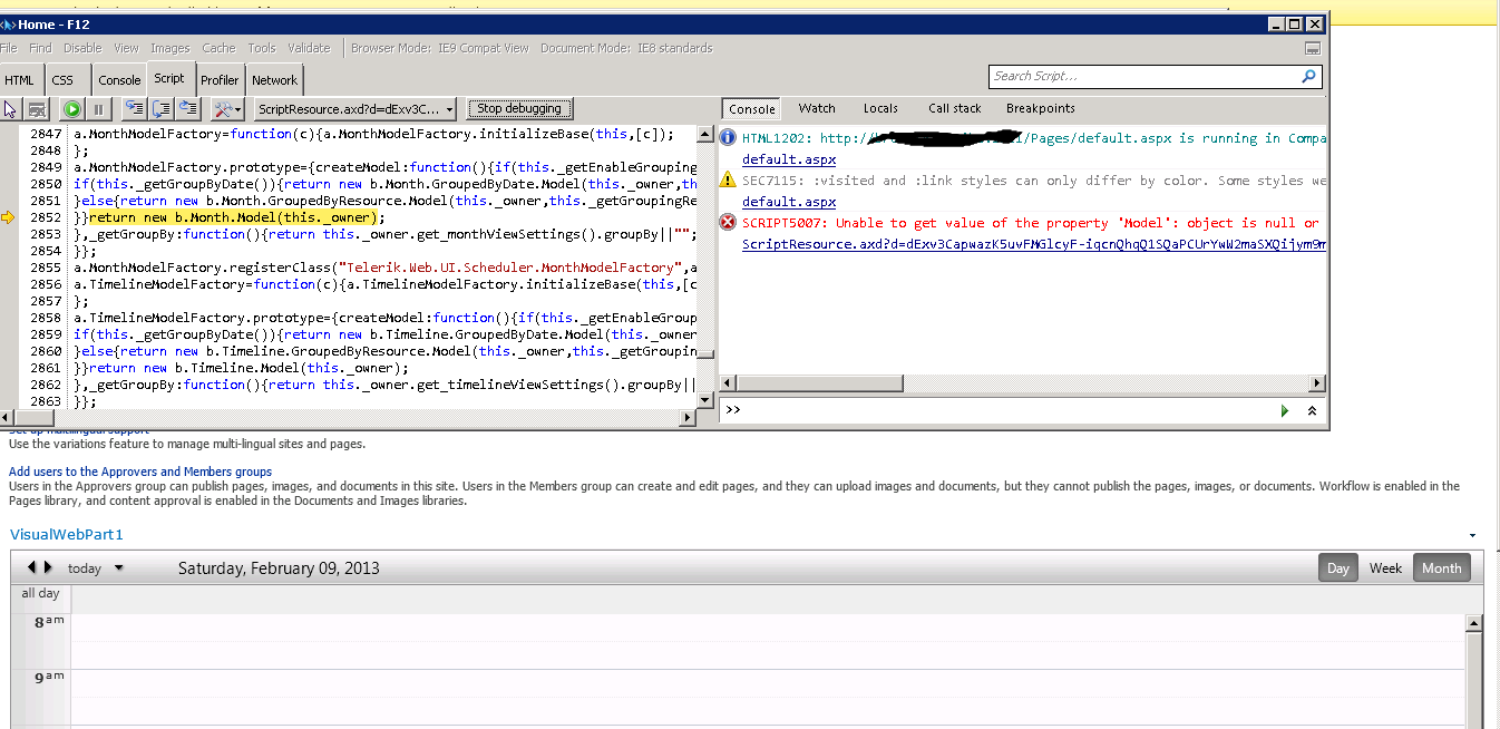 I have used a RadScheduler on my SharePoint 2010 site with IE8. But every time I try to navigate to "Day", "Week" and "Month", A script error pops-up. I am using Ajax for each request,