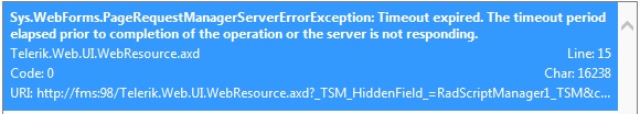 Currently have a rad grid that will load fine in development but once it is moved into production receive a script timeout error. In Production, the first load of the page works but have a RadComboBox that allows for Autopostback that changes the results in my RadGrid. It is at this point that I receive the timeout. Each time in production it will timeout after 30 seconds and have not figured out a way to stop it from timing out. I have compared the values with IIS to compare script timeouts and they are the same. It is trying to process 19,000 records, which I know it may take some time to query but in development the query doesn't take long at all to complete.