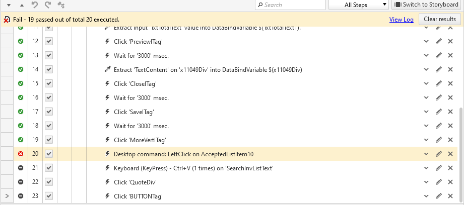 - Execute the failing test without continue on failure option and open the generated step failure details. You can analyze them to see what kind of error is causing the issue and attach the exported details (see exportStepFailureDetails.png), so I can also have a look. It is possible that the test execution is unable to find the target element on the page.