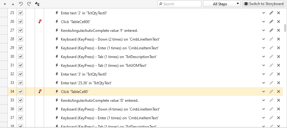Currently, the click action in step 83 happens against the second <div> tag, which is under the <kendo-grid> element. It seems to me that this is the header of the grid and I am not sure what it should actually click. Please review the element's find expression, as suggested above, and change it accordingly. You could also try to record the necessary action again, if there were any changes to the application after the initial recording.