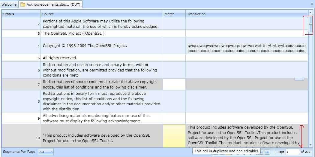 <TelerikGrid:RadGridView x:Name="segmentView" AutoGenerateColumns="False" CanUserSelect="False" TabNavigation="Once" IsTabStop="True" CanUserDeleteRows="False" ScrollMode="RealTime" CanUserFreezeColumns="False" CanUserInsertRows="False" CanUserReorderColumns="False" CanUserResizeColumns="True" CanUserSortColumns="False" ShowColumnFooters="False" ShowGroupFooters="False" ShowGroupPanel="False" ShowInsertRow="False" IsFilteringAllowed="False" RowIndicatorVisibility="Collapsed" IsReadOnly="True" IsSynchronizedWithCurrentItem="False" AlternateRowBackground="#E5EFFA" AlternationCount="2" EnableRowVirtualization="True" IsScrolling="True" CellEditEnded="segmentView_CellEditEnded" BeginningEdit="segmentView_BeginningEdit" CurrentCellChanged="segmentView_CurrentCellChanged" SelectedCellsChanged="segmentView_SelectedCellsChanged"><!--Changed by Tyler for Spell Check--> <TelerikGrid:RadGridView.Columns> <local:SegmentNotifyColumn Header="Status " Width="130"/> <local:SourceSegmentColumn Header="Source" DataMemberBinding="{Binding SourceText}" Width="*" /> <local:SegmentInfoColumn Header="Match" DataMemberBinding="{Binding SegCharacteristics}" Width="75" /> <local:TargetSegmentColumn Header="Translation" DataMemberBinding="{Binding TargetText}" Width="*" /> </TelerikGrid:RadGridView.Columns> </TelerikGrid:RadGridView> </Grid> <Grid Grid.Row="1"> <StackPanel Orientation="Horizontal"> <TextBlock Text="Segments Per Page " Margin="5,5,5,5" HorizontalAlignment="Left" /> <telerik:RadComboBox Grid.Row="1" Name="segPerPageCB" Height="10" SelectionChanged="segPerPageCB_SelectionChanged" Width="52" HorizontalAlignment="Left" /> </StackPanel> <TelerikData:RadDataPager Grid.Row="1" x:Name="dataPager" PageSize="50" DisplayMode="All" HorizontalAlignment="Right" /> <controlsToolkit:BusyIndicator Grid.RowSpan="1" x:Name="MyBusyIndicator" IsBusy="False" Visibility="Collapsed" /> </Grid>I have a telerik gridview in my silverligt application.I am facing a probelm When I write some text in Cell of grid and height of cell is increased but scroll bar of grid is not automatically coming down by which text of cell hides .When we scroll manually then text is visible.