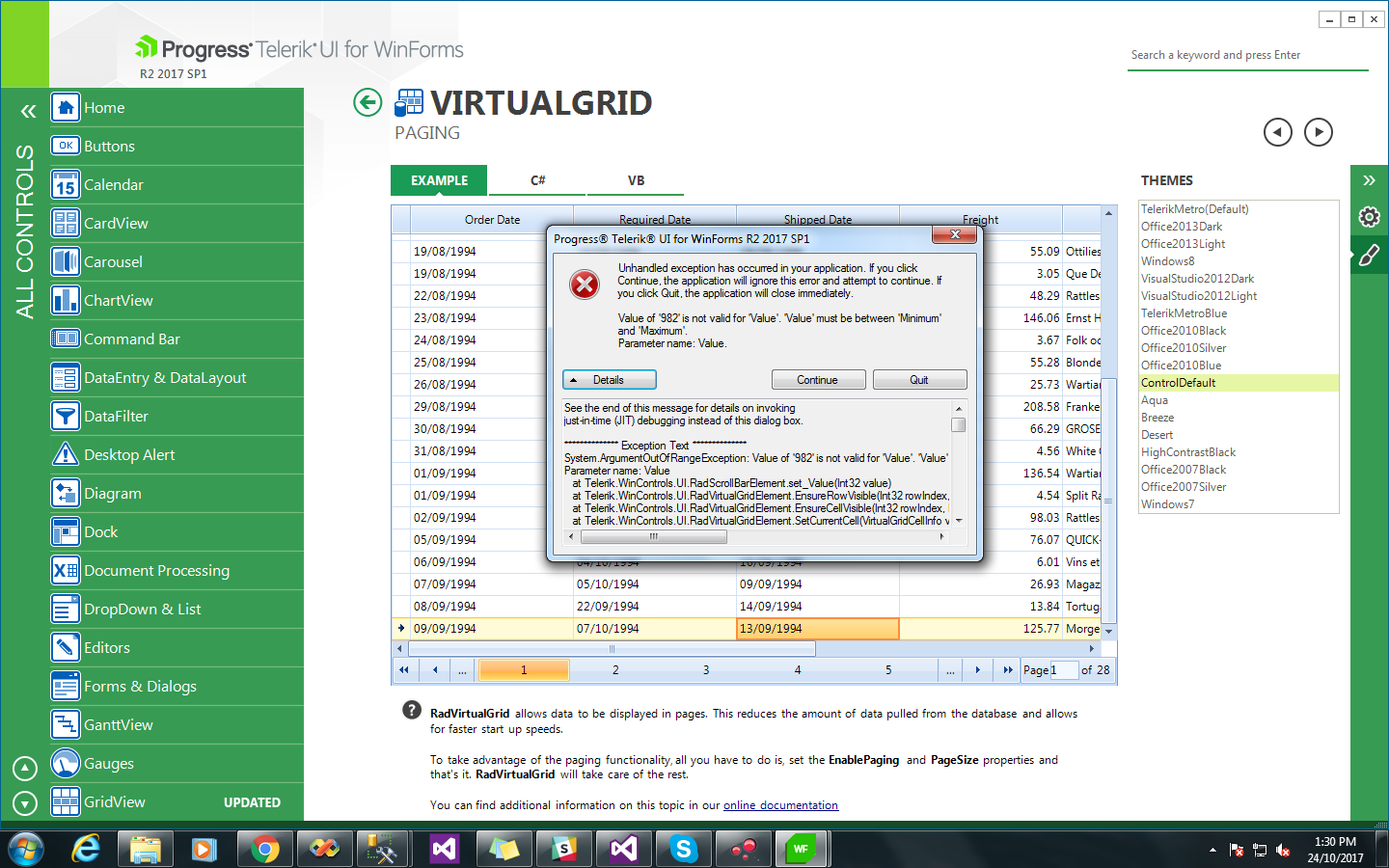 after loading full data to rad virtual grid with pagination is enabled , while pressing arrow down button to select row in the grid, at last row when i pressing arrow down visual studio throws an error, i attached an image for the error description.