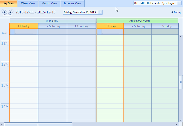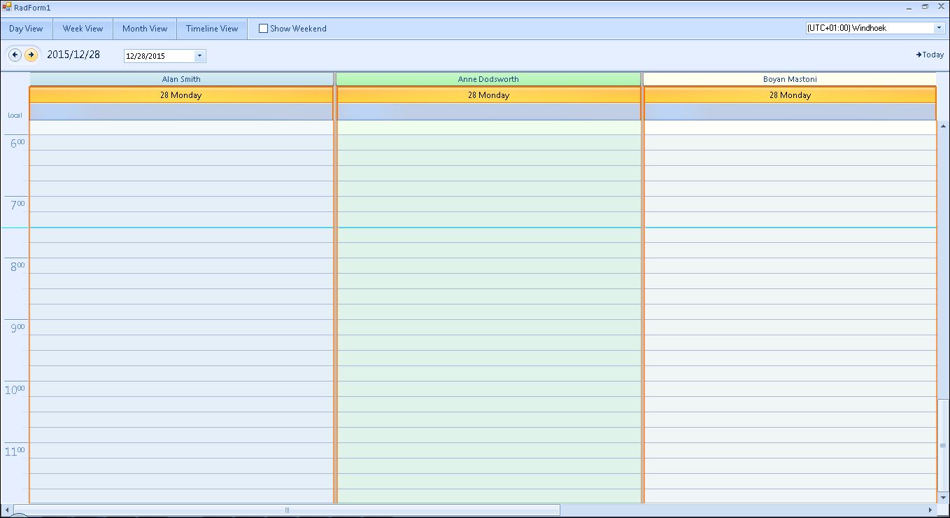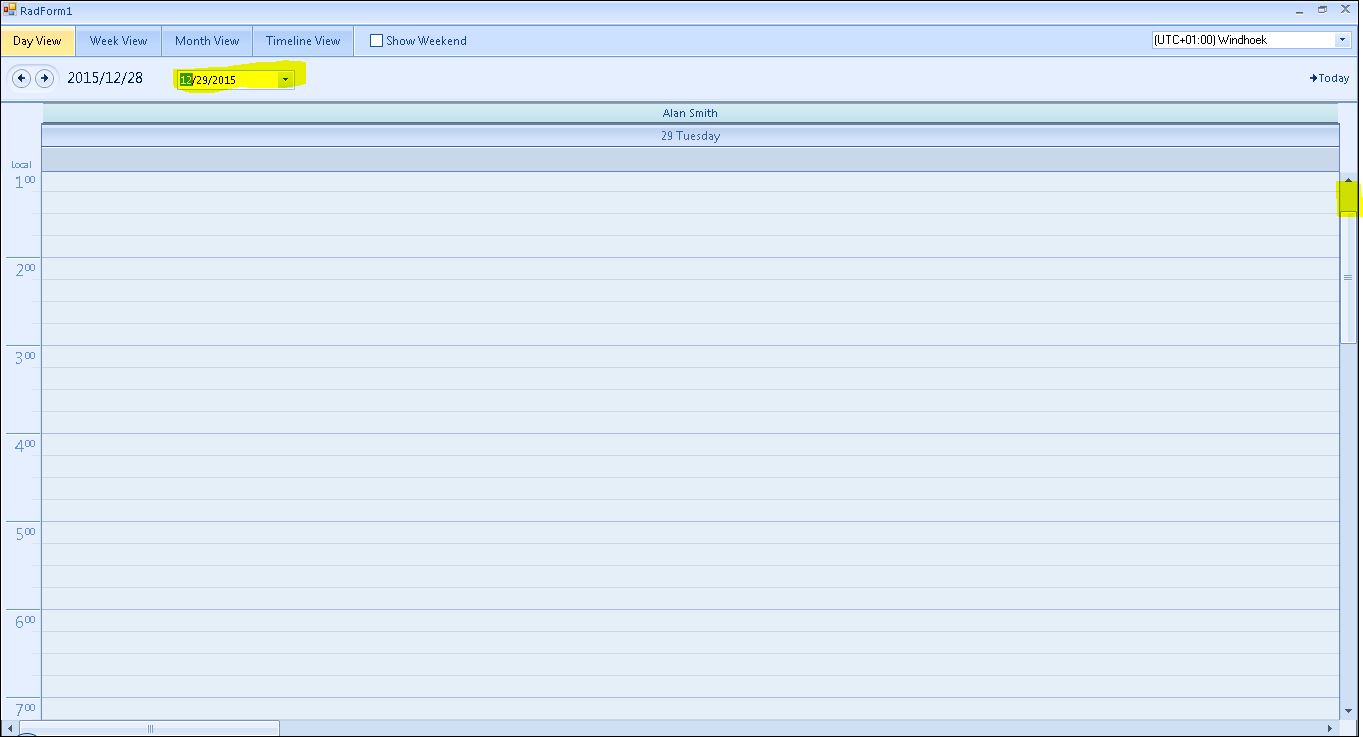 using System;using System.Collections.Generic;using System.ComponentModel;using System.Data;using System.Drawing;using System.Text;using System.Windows.Forms;using Telerik.WinControls;using Telerik.WinControls.UI;namespace SchedulerGroupResourceExample{ public partial class RadForm1 : Telerik.WinControls.UI.RadForm { public RadForm1() { InitializeComponent(); this.radScheduler1.ActiveViewType = SchedulerViewType.Day; Color[] colors = new Color[] { Color.LightBlue, Color.LightGreen, Color.LightYellow, Color.Red, Color.Orange, Color.Pink, Color.Purple, Color.Peru, Color.PowderBlue}; string[] names = new string[] { "Alan Smith" //, "Anne Dodsworth", //"Boyan Mastoni", "Richard Duncan", "Maria Shnaider" }; for (int i = 0; i < names.Length; i++) { Resource resource = new Resource(); resource.Id = new EventId(i); resource.Name = names[i]; resource.Color = colors[i]; this.radScheduler1.Resources.Add(resource); } this.radScheduler1.GroupType = GroupType.Resource; SchedulerDayViewBase view = this.radScheduler1.SchedulerElement.View as SchedulerDayViewBase; view.RangeFactor = ScaleRange.QuarterHour; } protected override void OnLoad(EventArgs e) { base.OnLoad(e); SchedulerDayViewGroupedByResourceElement mainElement = this.radScheduler1.SchedulerElement.ViewElement as SchedulerDayViewGroupedByResourceElement; mainElement.ScrollToTime(DateTime.Now.TimeOfDay); //foreach (RadElement el in mainElement.Children) //{ // SchedulerDayViewElement dayView = el as SchedulerDayViewElement; // if (dayView != null) // { // dayView.DataAreaElement.Table.ScrollToTime(DateTime.Now.TimeOfDay); // } //} } private void radDateTimePicker1_ValueChanged(object sender, EventArgs e) { this.radScheduler1.FocusedDate = this.radDateTimePicker1.Value; SchedulerDayViewGroupedByResourceElement mainElement = this.radScheduler1.SchedulerElement.ViewElement as SchedulerDayViewGroupedByResourceElement; SchedulerDayView dayView1 = this.radScheduler1.GetDayView(); dayView1.DayCount = 1; mainElement.ScrollToTime(DateTime.Now.TimeOfDay); //foreach (RadElement el in mainElement.Children) //{ // SchedulerDayViewElement dayView = el as SchedulerDayViewElement; // if (dayView != null) // { // dayView.DataAreaElement.Table.ScrollToTime(DateTime.Now.TimeOfDay); // } //} } }}Note : We can use following code also instead of "Foreach" to set "ScrollToTime"