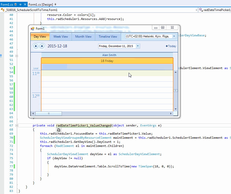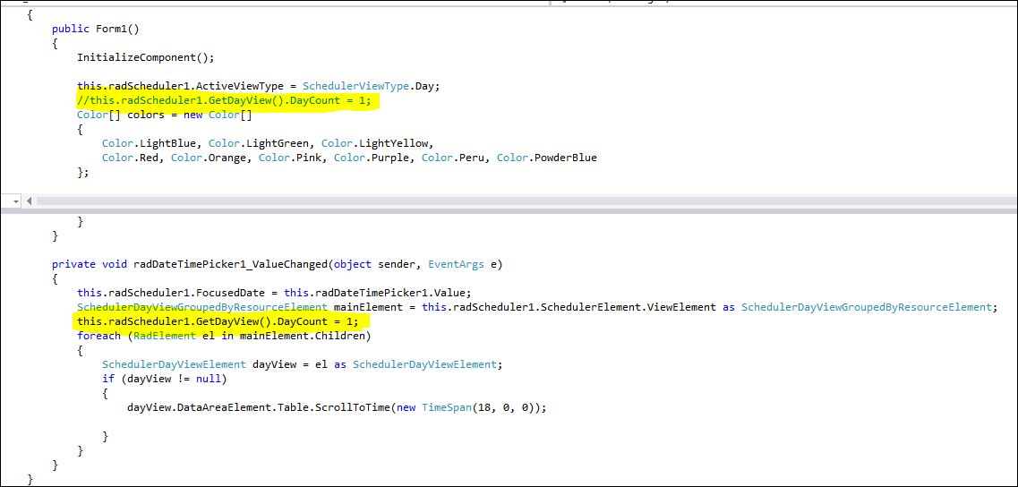 namespace _516016_SchedulerScrollToTime{ public partial class Form1 : Form { public Form1() { InitializeComponent(); this.radScheduler1.ActiveViewType = SchedulerViewType.Day; this.radScheduler1.GetDayView().DayCount = 1; Color[] colors = new Color[] { Color.LightBlue, Color.LightGreen, Color.LightYellow, Color.Red, Color.Orange, Color.Pink, Color.Purple, Color.Peru, Color.PowderBlue }; string[] names = new string[] { "Alan Smith", "Anne Dodsworth", "Boyan Mastoni", "Richard Duncan", "Maria Shnaider" }; for (int i = 0; i < names.Length; i++) { Resource resource = new Resource(); resource.Id = new EventId(i); resource.Name = names[i]; resource.Color = colors[i]; this.radScheduler1.Resources.Add(resource); } this.radScheduler1.GroupType = GroupType.Resource; this.radScheduler1.ActiveView.ResourcesPerView = 3; //My code change SchedulerDayViewBase view = this.radScheduler1.SchedulerElement.View as SchedulerDayViewBase; view.RangeFactor = ScaleRange.QuarterHour; } protected override void OnLoad(EventArgs e) { base.OnLoad(e); SchedulerDayViewGroupedByResourceElement mainElement = this.radScheduler1.SchedulerElement.ViewElement as SchedulerDayViewGroupedByResourceElement; foreach (RadElement el in mainElement.Children) { mainElement.ScrollToTime(DateTime.Now.TimeOfDay); } } private void radDateTimePicker1_ValueChanged(object sender, EventArgs e) { this.radScheduler1.FocusedDate = this.radDateTimePicker1.Value; SchedulerDayViewGroupedByResourceElement mainElement = this.radScheduler1.SchedulerElement.ViewElement as SchedulerDayViewGroupedByResourceElement; this.radScheduler1.ActiveView.ResourcesPerView = 1; //My code change foreach (RadElement el in mainElement.Children) { SchedulerDayViewElement dayView = el as SchedulerDayViewElement; if (dayView != null) { dayView.DataAreaElement.Table.ScrollToTime(new TimeSpan(18, 0, 0)); } } } }}Thanks