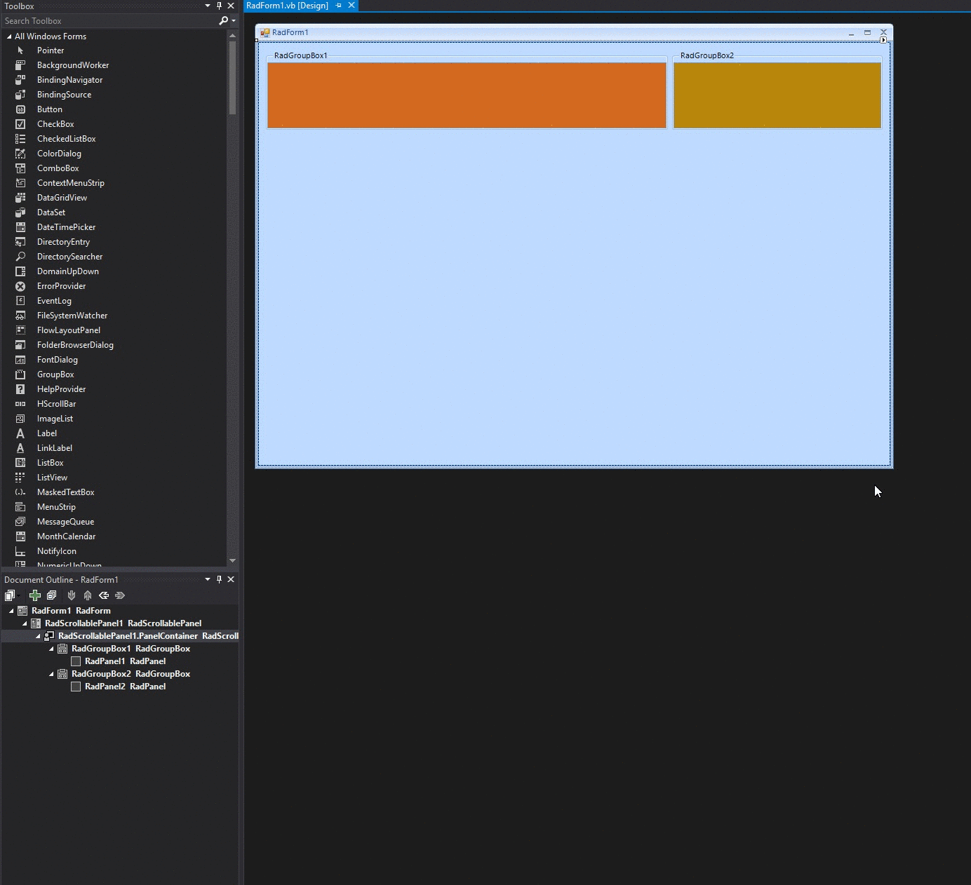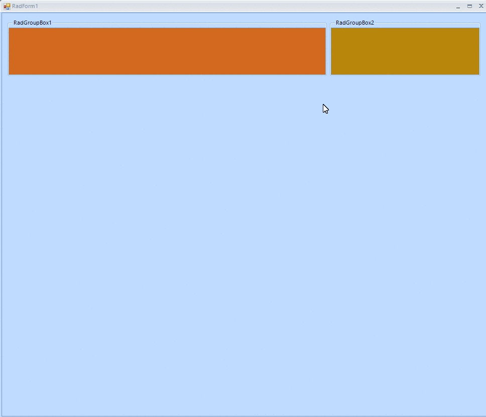 Wrap both GroupBoxes in RadLayoutControl. Set Dock = Fill for RadLayoutControl.