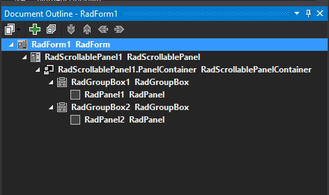 I would like to note that RadScrollablePanel is supposed to show scrollbars when some of the content controls are positioned at a location outside the panel size. However, in the described scenario and the illustrated gif file, when shrinking RadScrollablePanel, the two RadGroupBox controls are repositioned and at a certain point they overlap each other. None of them is outside the visible area of RadScrollablePanel. That is why the scrollbars are not shown. Similar behavior is observed with a standard MS Panel (AutoScroll=true) and GroupBox controls. Please refer to the attached gif file.