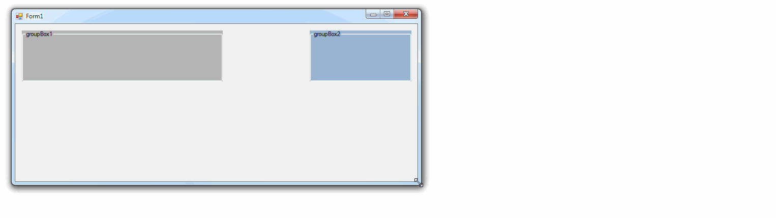 It is normal that the design time resizing behavior is similar to the one. Note that exactly the same behavior is observed with the standard MS controls. In order to show the horizontal scrollbar when shrinking the form, you should leave the radGroupBox2.Anchor property to its default value Top|Left.