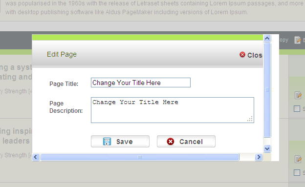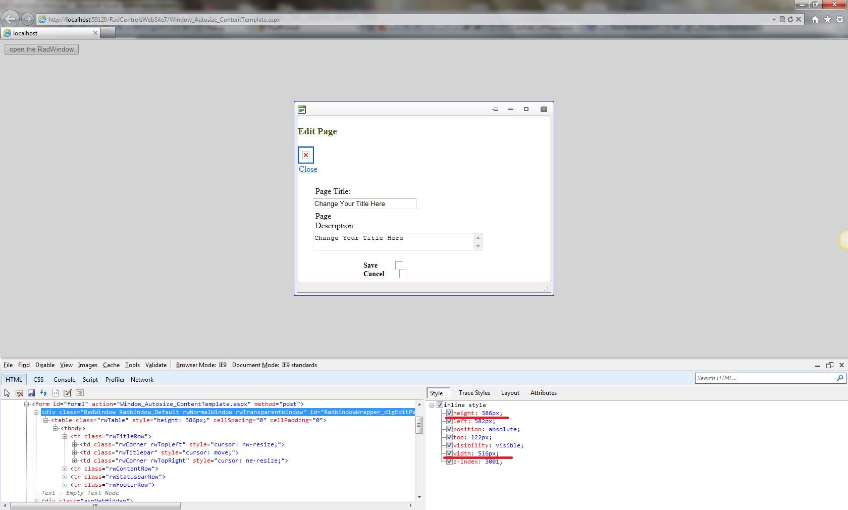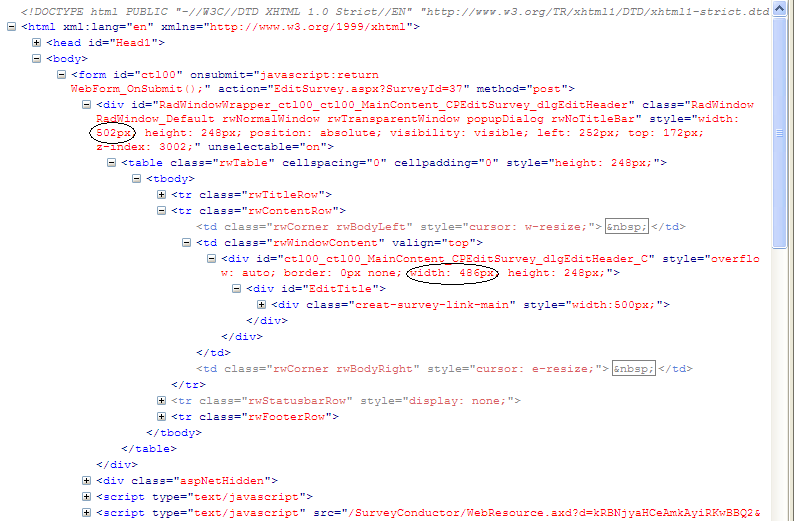 <telerik:RadWindow runat="server" ID="dlgEditPage" Modal="true" AutoSize="true" Width="506" MaxWidth="510" Top="50" Height="258" MaxHeight="260"><br> <ContentTemplate><br> <div id="EditTitle"><br><br> <div class="creat-survey-link-main" style="width:500px;"><br> <div><br> <div class="header-secondtop-line border-grey"></div><br> <div class="creat-survey-link-header-main" style="width:500px;"><br> <h3 class="creat-survey-link-green-heading float-lt" style="color:#405d0b;">Edit Page</h3><br> <div class="float-rt creat-survey-link-close" onclick="javascript:CloseRadWindow()" > <a href="javascript:void(0)"> <img src="../images/Close_icon.png" class="float-lt" /><br> <div class="float-lt" style="margin-top:2px; margin-left:2px;">Close</div><br> </a><br> <div class="clear"></div><br> </div><br> <div class="clear"></div><br> <div style="padding:20px 30px; background:#fff"><br> <div><br> <div class="title float-lt" style="padding:5px; width:80px; text-align:left;">Page Title:</div><br> <div class="float-lt"><input type="text" value="Change Your Title Here" style="width:200px;" /></div><br> <div class="clear"></div><br> </div><br> <div class="marTop"><br> <div class="title float-lt" style="padding:5px; width:80px; text-align:left;">Page Description:</div><br> <div class="float-lt"><textarea type="text" style="width:330px;">Change Your Title Here </textarea></div><br> <div class="clear"></div><br> </div> <br> <div class="clear"></div> <br> <br> <div style="float:left; margin:20px 0px 0px 90px;"><br> <div class="creat-folder-button-curve"><img src="../images/Save.png" style="padding-left:25px;" class="float-lt" width="16" /> <strong style="font-size:14px; padding:0px 10px; display:block; float:left;">Save</strong></div><br> <div class="creat-folder-button-curve" onclick="javascript:CloseRadWindow()"><img src="../images/close.png" style="padding-left:20px;" class="float-lt" width="16" /> <strong style="font-size:14px; padding:0px 10px; display:block; float:left;">Cancel</strong></div><br> </div><br> <div class="clear"></div> <br> </div><br> <br> <br> </div> <br> </div><br> </div><br><br> </div><br> </ContentTemplate><br> </telerik:RadWindow>& it's rendered html
